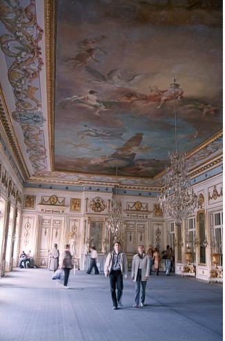 Это бальный зал в Кусково (Москва). На полу "коммерческий" ковролин скрывающий (и сохраняющий) листвиничный паркет "квадратами".