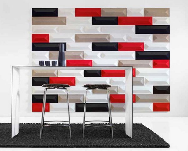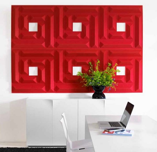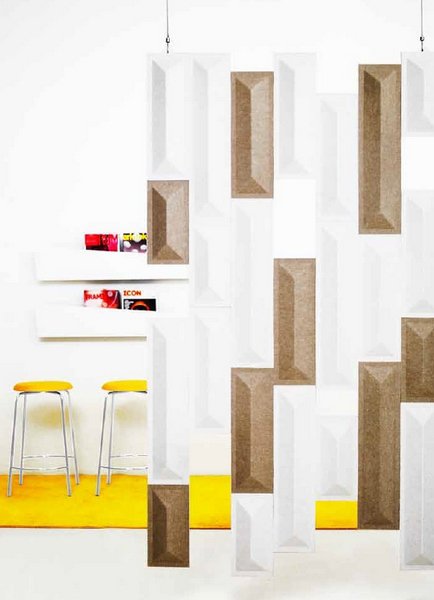 Так, дизайнер Joel Karlsson из компании Karl Andersson&Soner предпочитает толстый и плотный фетр. Из него изготавливают прямоугольные плитки для стен и создания подвесных перегородок, зонирующих пространство. Такой фетр обеспечивает прекрасную шумоизоляцию, что удобно, например, при обустройстве музыкальной комнаты в доме. Узор, вдохновленный рисунком классического паркета, открывает немало возможностей для импровизации и создания собственные цветовых схем и узоров.