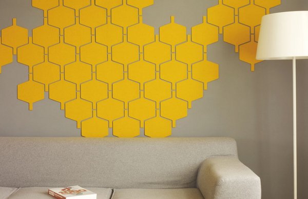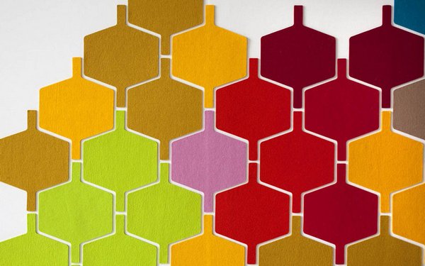 Шестигранники, изготовленные из натуральной шерсти, можно приклеить на стену в любом месте и любым способом. На выбор предоставляется 14 цветов, из которых можно создать небольшую декоративную композицию, хотя плитку можно использовать и для того, чтобы оформить стену целиком.