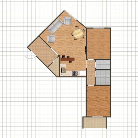 Купили 2х комнатную квартиру такой планировки. Планируем сделать 2 спальни, т.е. кухня будет перенесена в проходную комнату и будет выполнять так же функцию гостиной. Но как лучше поделить пространство? Хотелось бы иметь диванную зону и полноценную кухню, а разделить все это барной стойкой (от обеденного стола мы отказались) Помогите пожалуйста)))