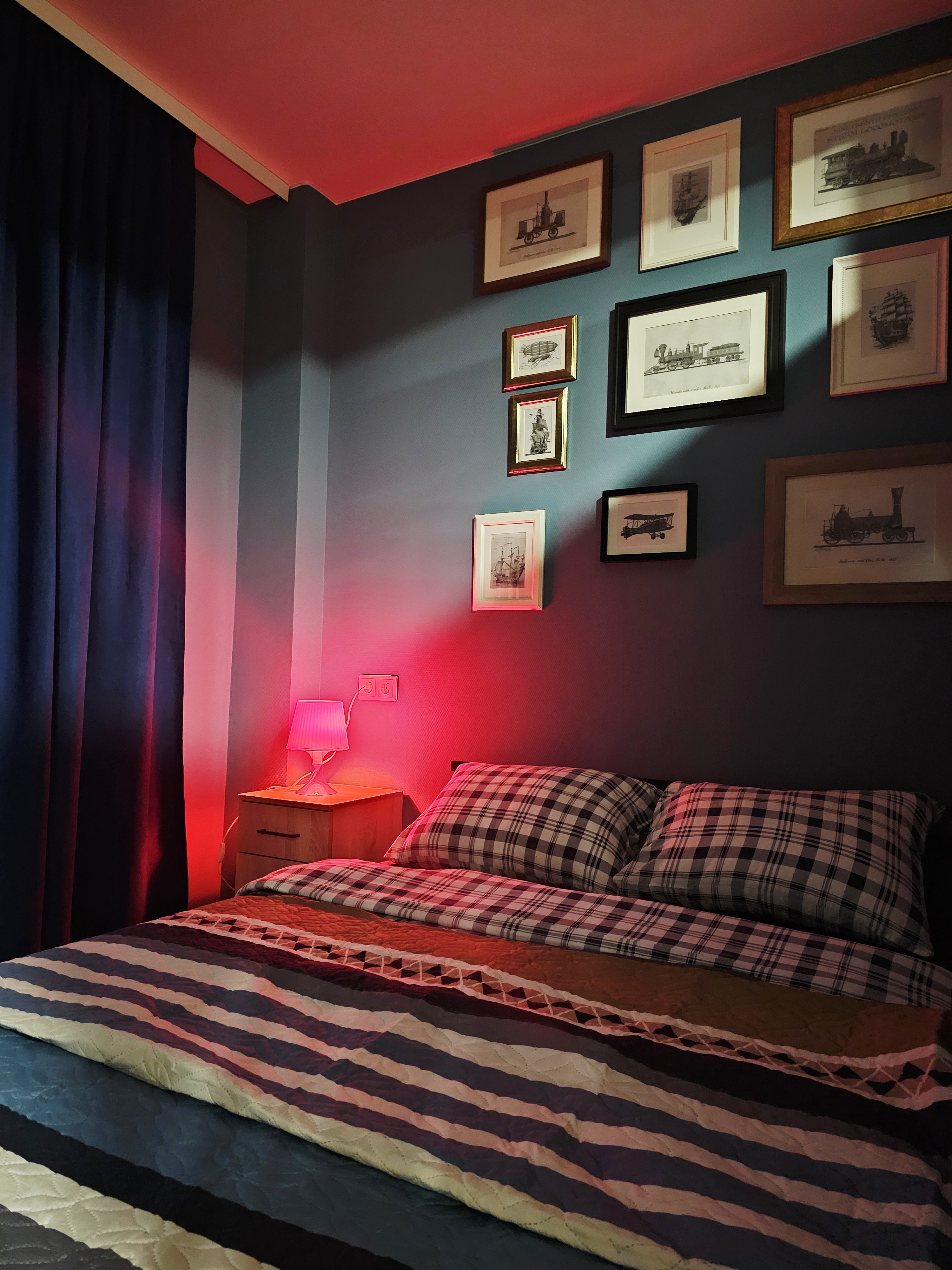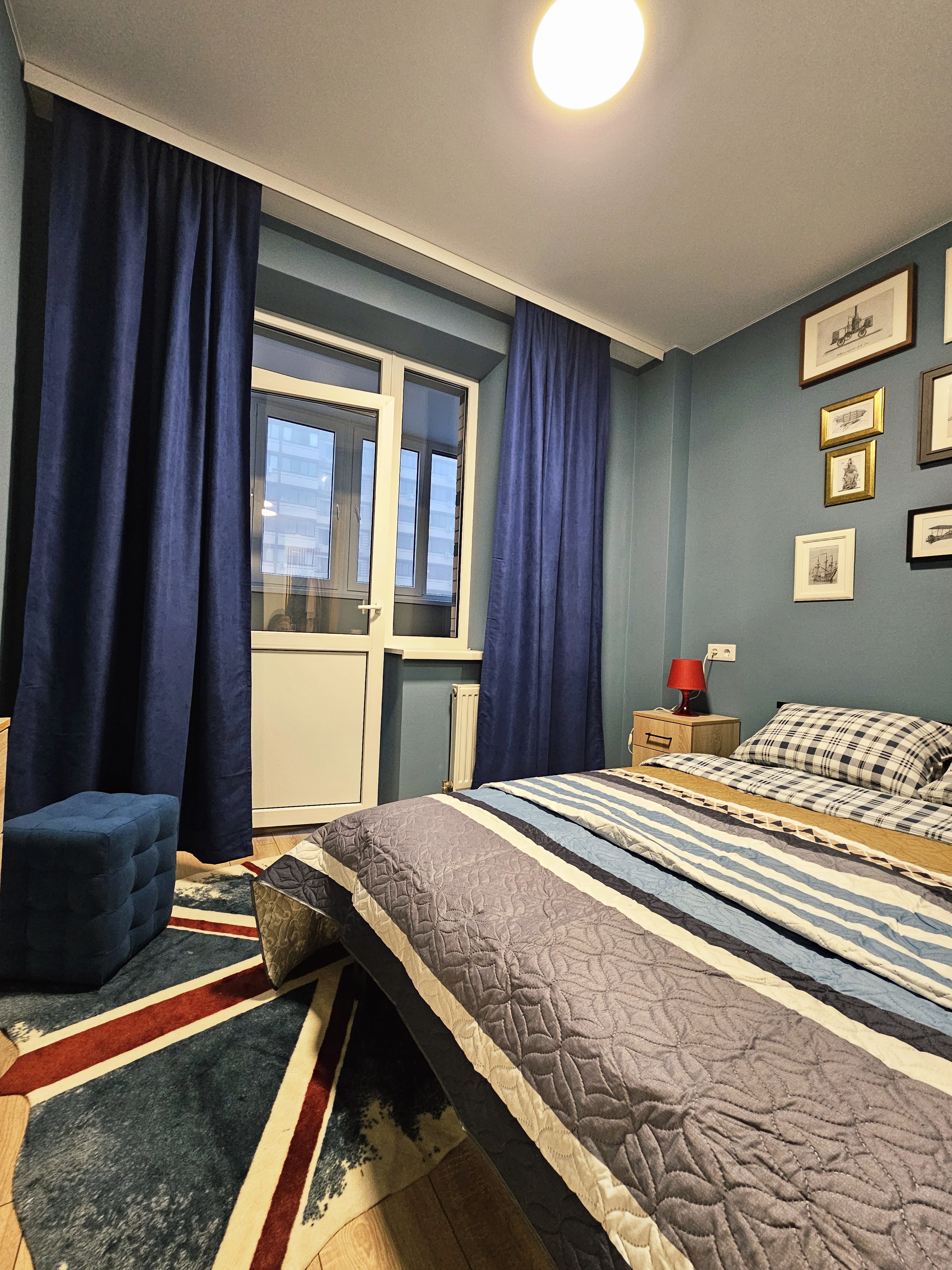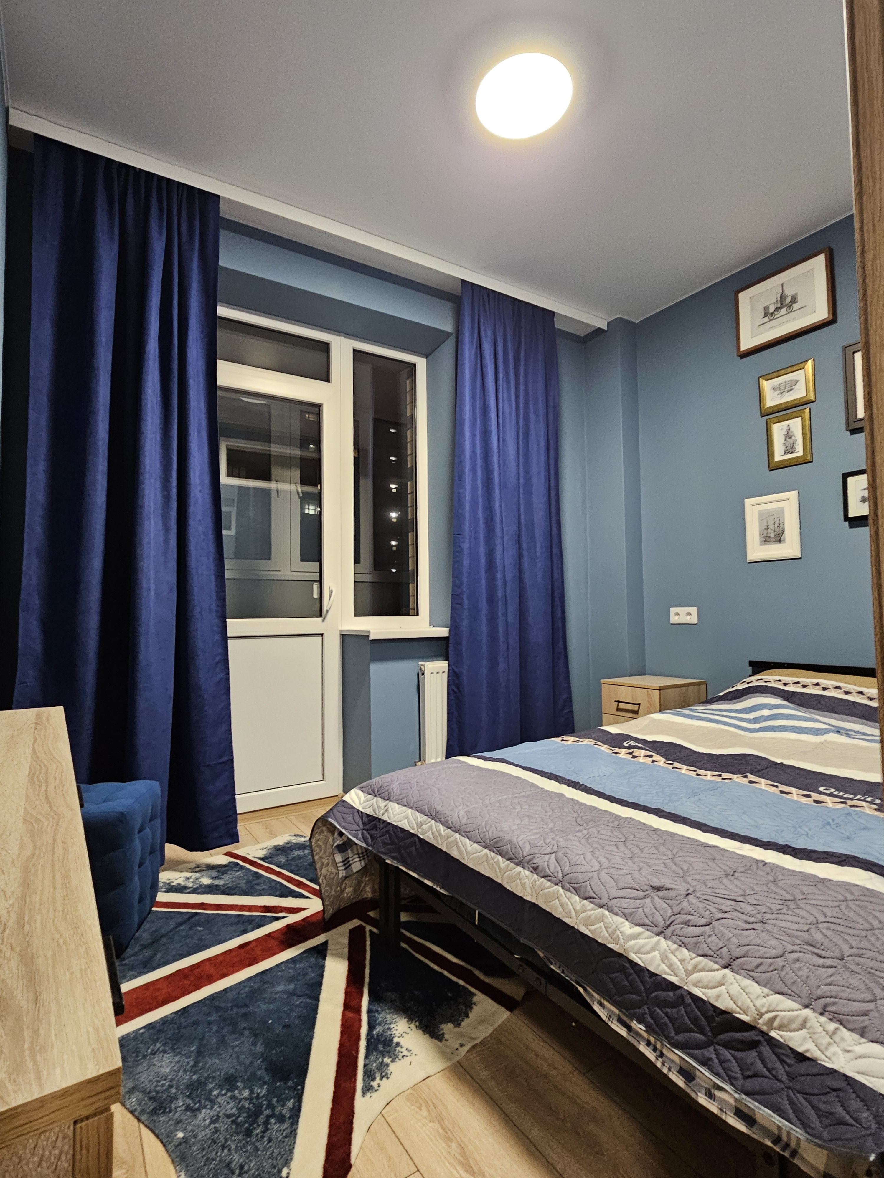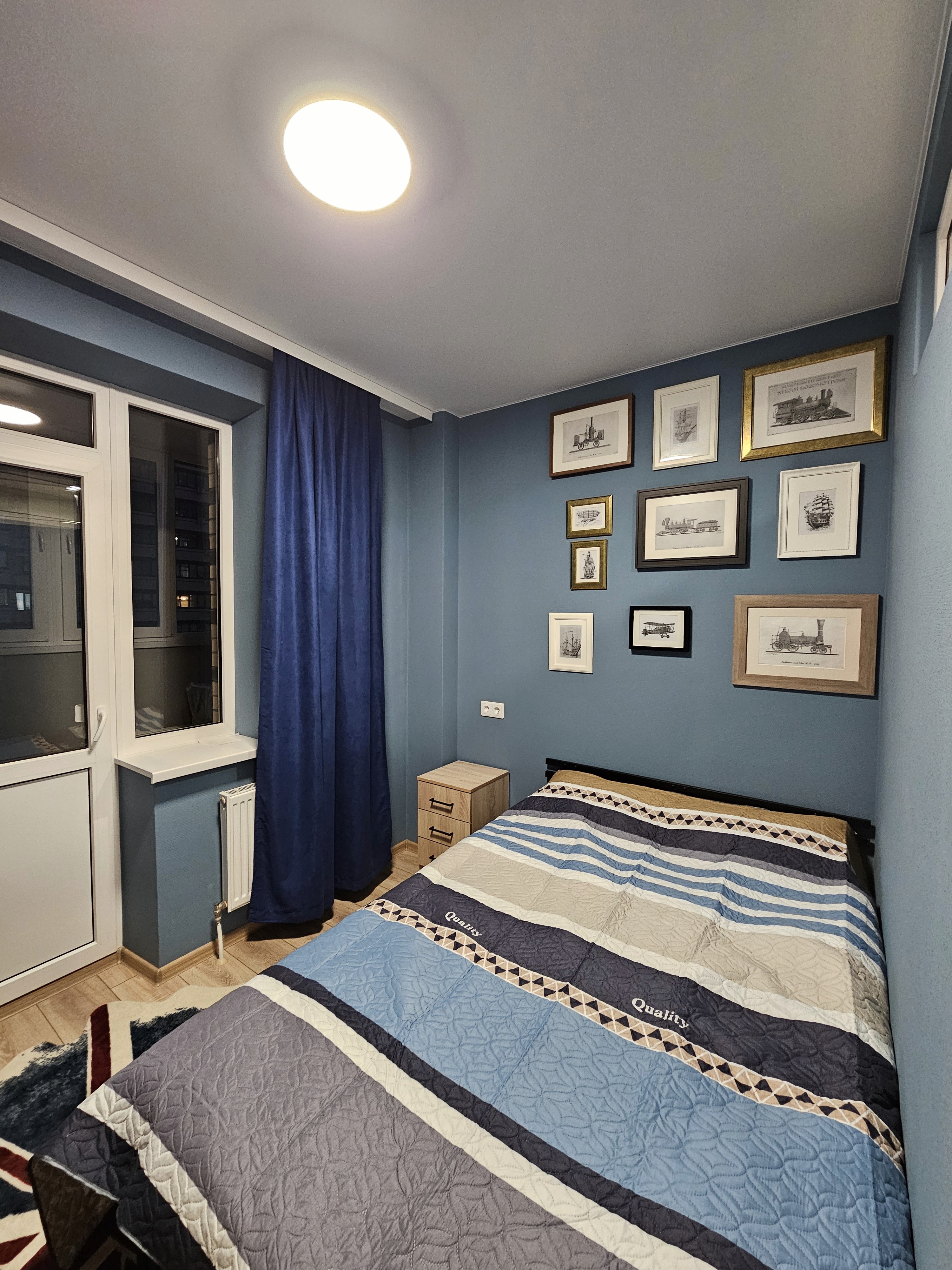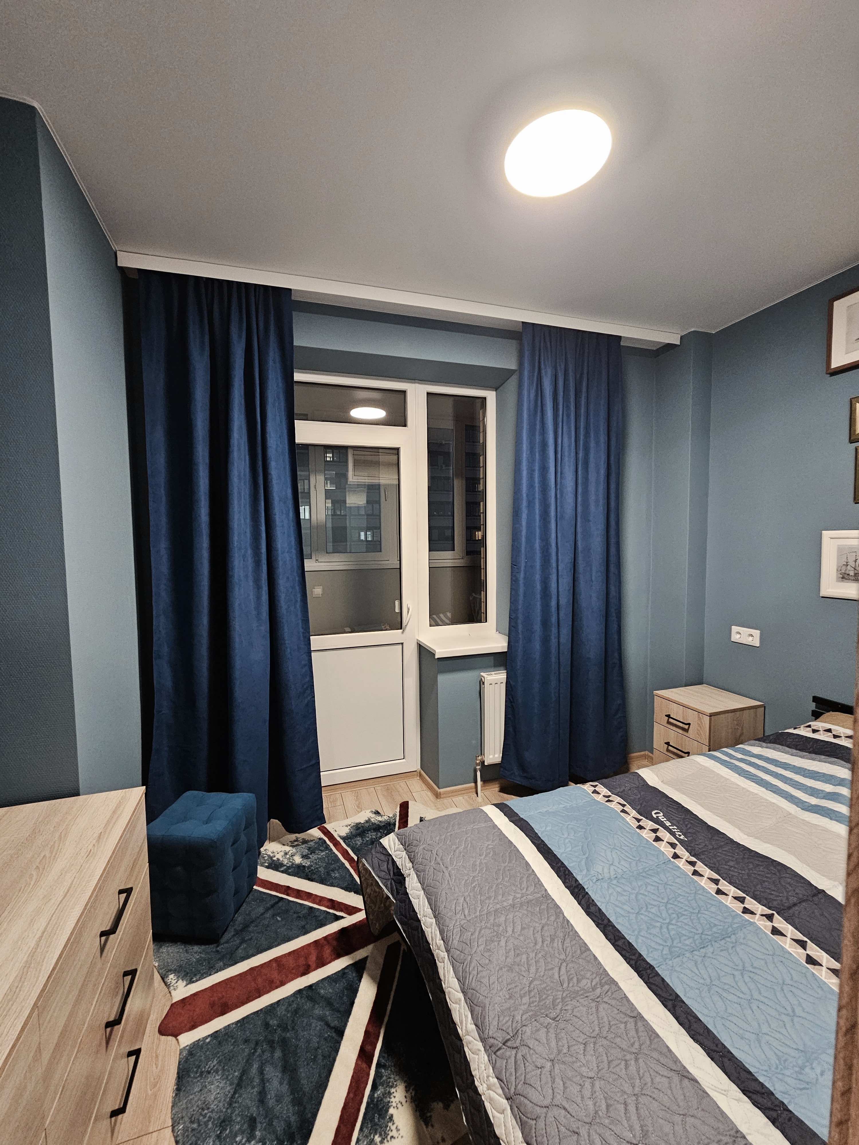 Синяя спальня с лоджией. Лоджия утеплена, там расположено рабочее место