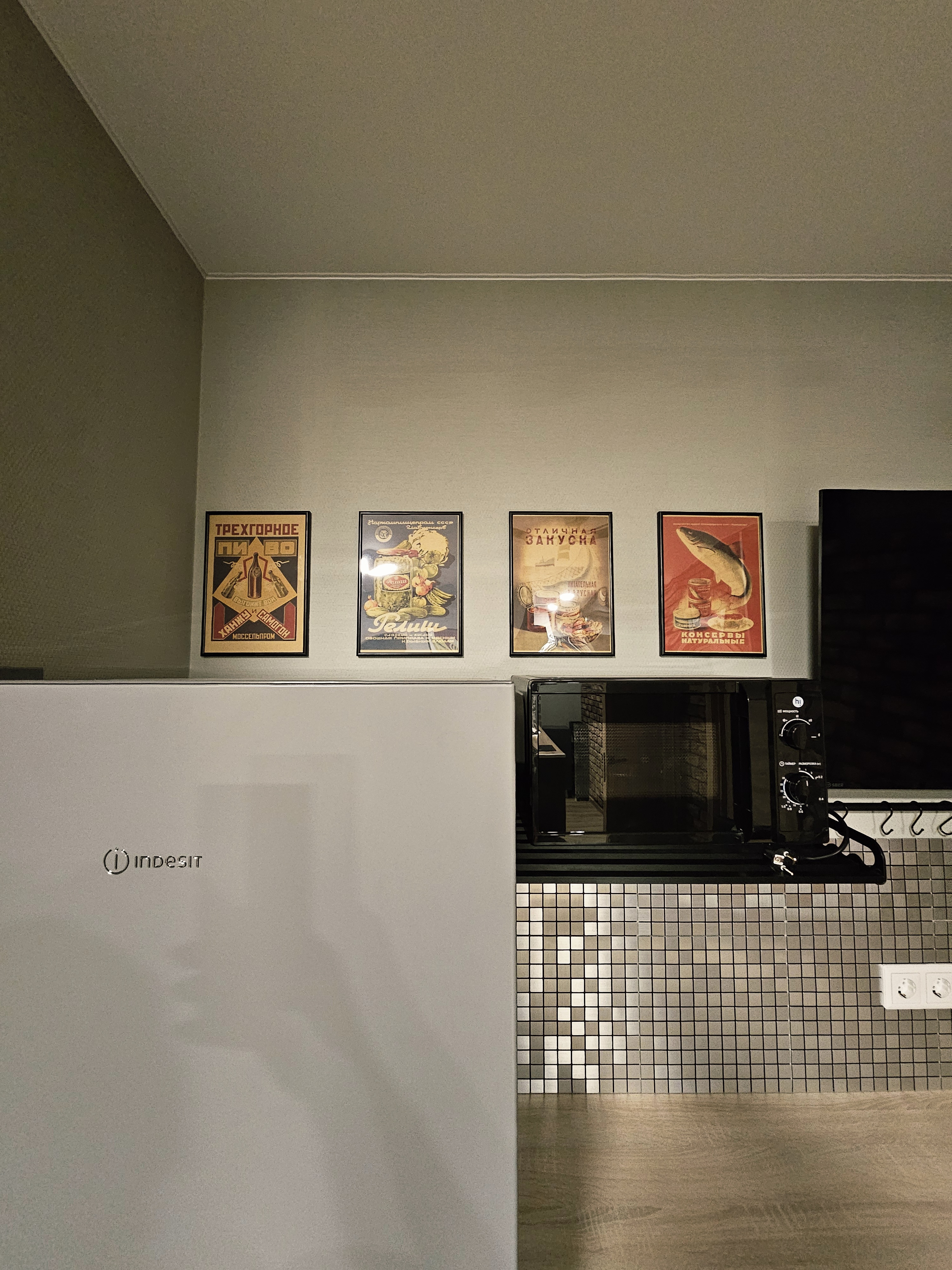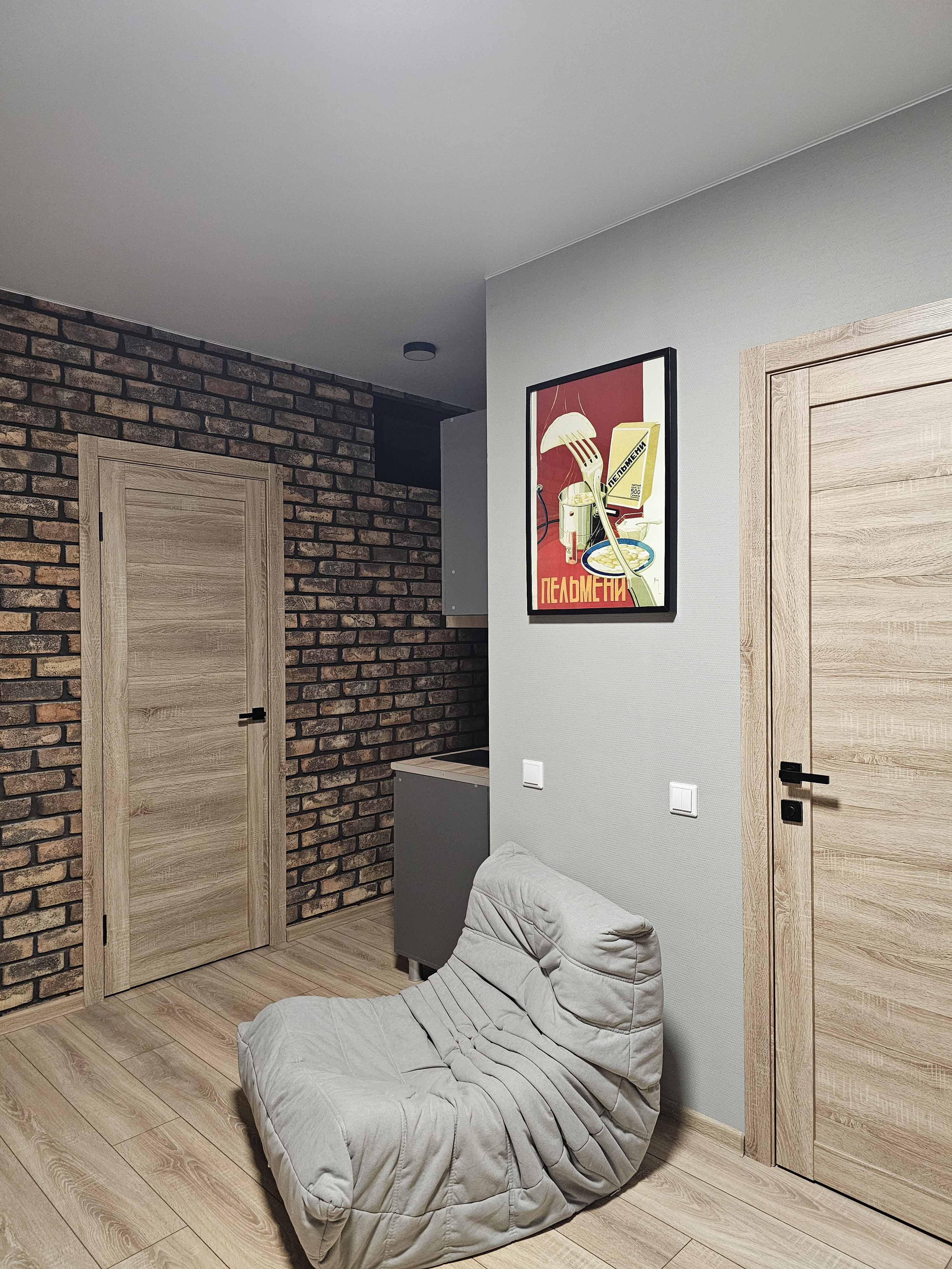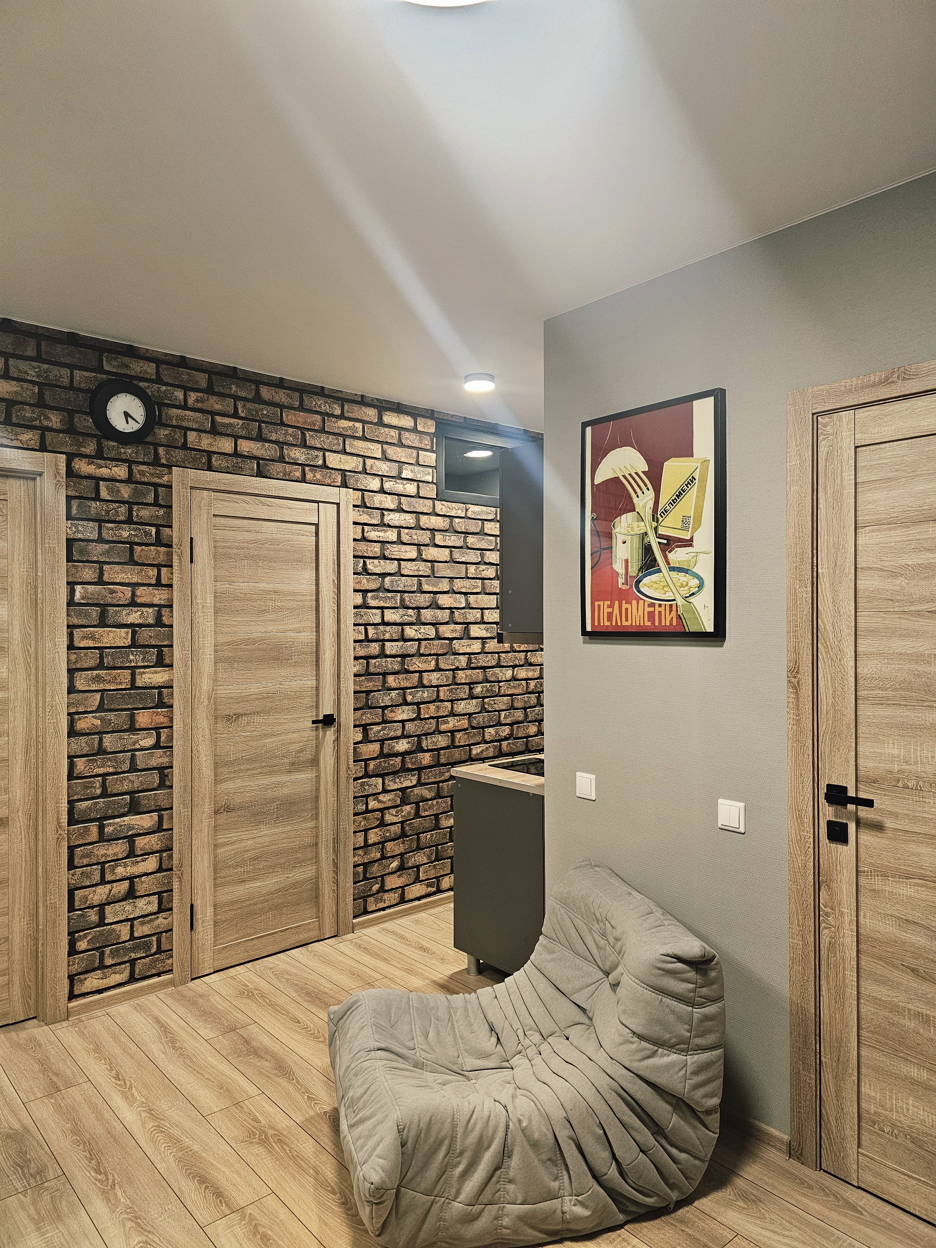 Слева от входной двери (справа на фото) гардеробная с гладильной доской, справа (дверь около картины с пельменями) ванная комната. Кухня поделега на 2 зоны, справа зона готовки, слева зона столовой с телевизором, в кирпичной стене две двери - вход в две раздельные спальни