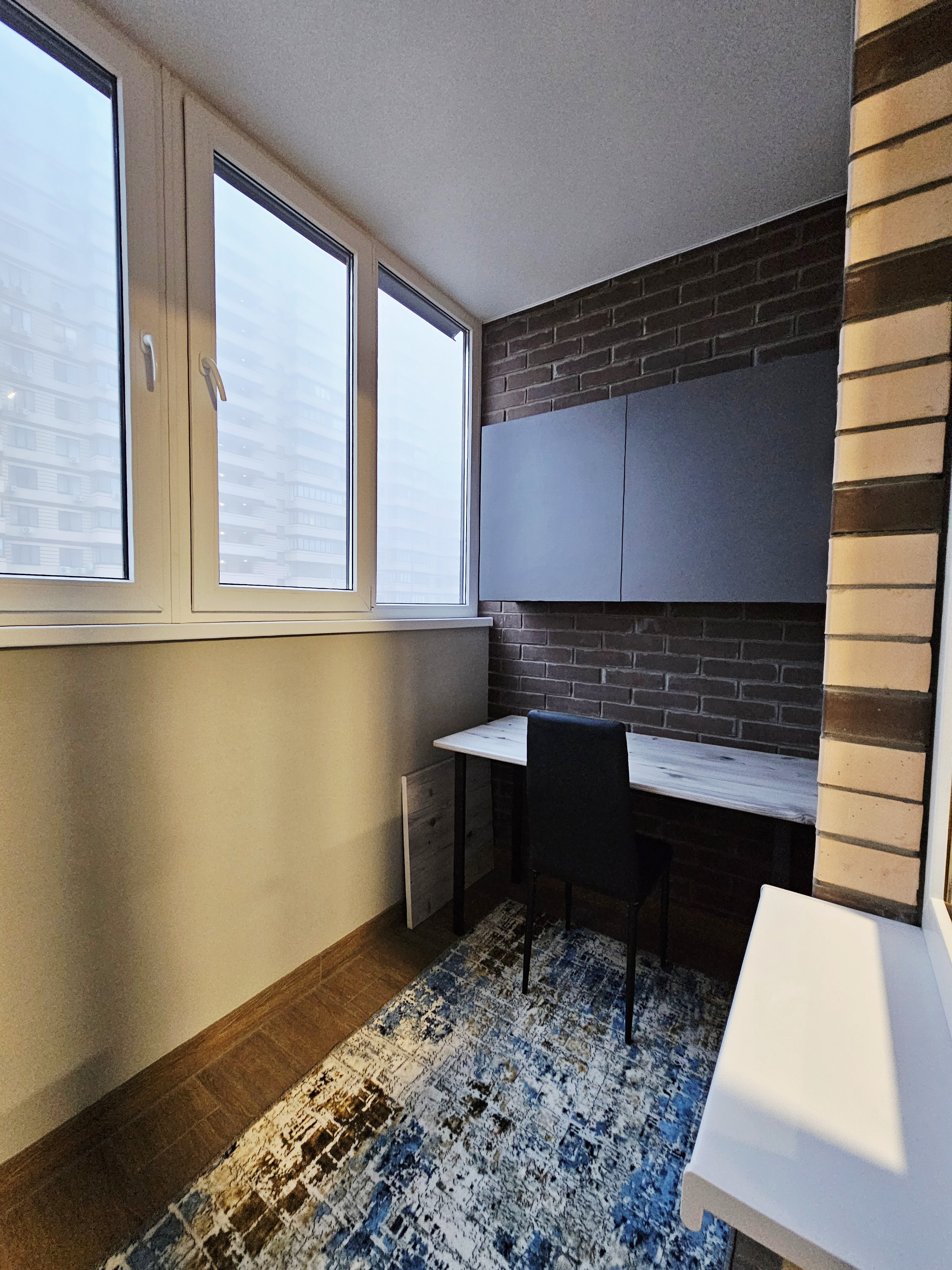 Кровать шириной 140 см, лоджия шириной 130 см, утеплена, там стоит рабочий стол 120 см шириной, шкафы навесные над столом для хранения и стул
