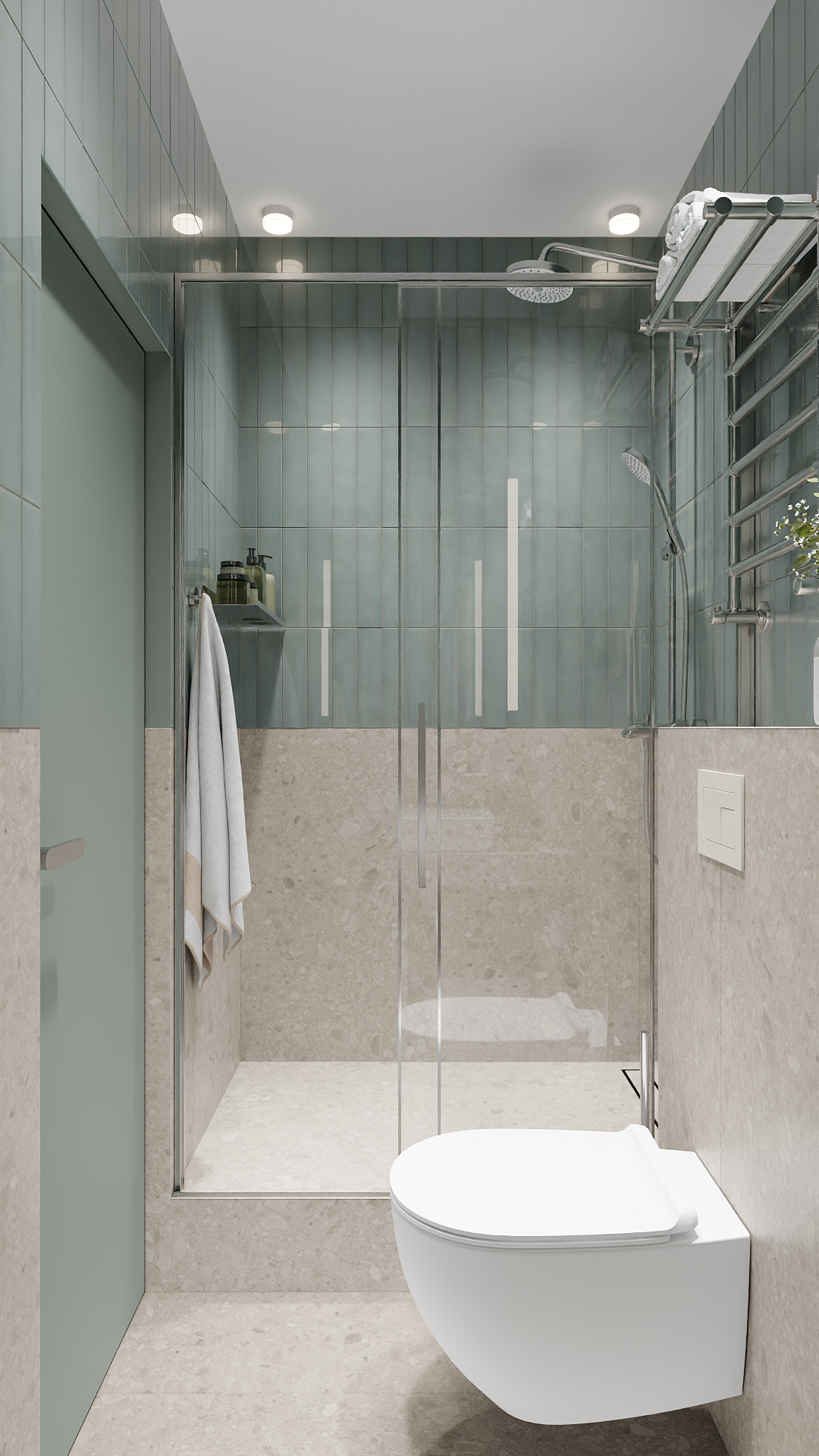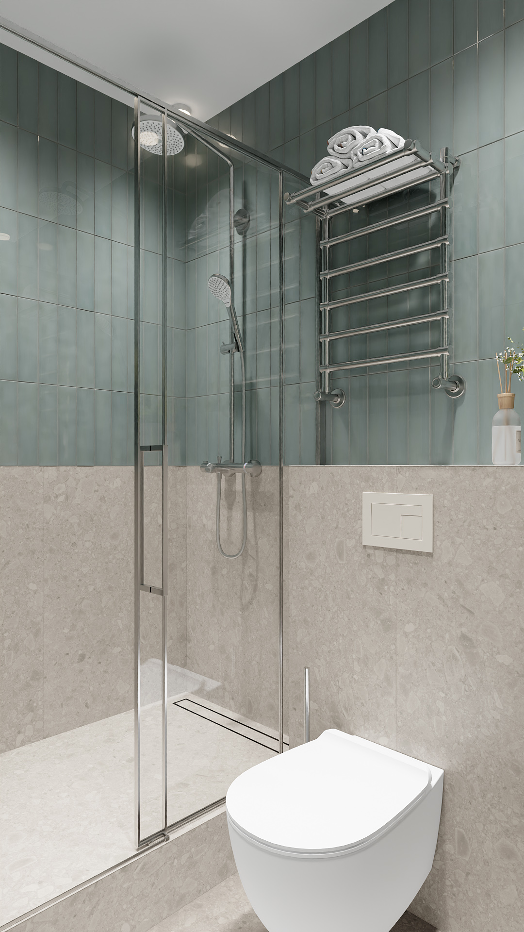 Современная ванная с душевой в минималистичном стиле: сочетание серо-бежевой фактурной плитки внизу и спокойной бирюзовой кафельной кладки вверху. Центральные элементы — стеклянная душевая кабина с хромированной фурнитурой и подвесной унитаз с лаконичной кнопкой смыва. Акценты: стильный металлический полотенцесушитель с аккуратно сложенными полотенцами, небольшая ваза с сухоцветами. Чистые линии, нейтральная палитра и функциональные детали создают ощущение свежести и порядка