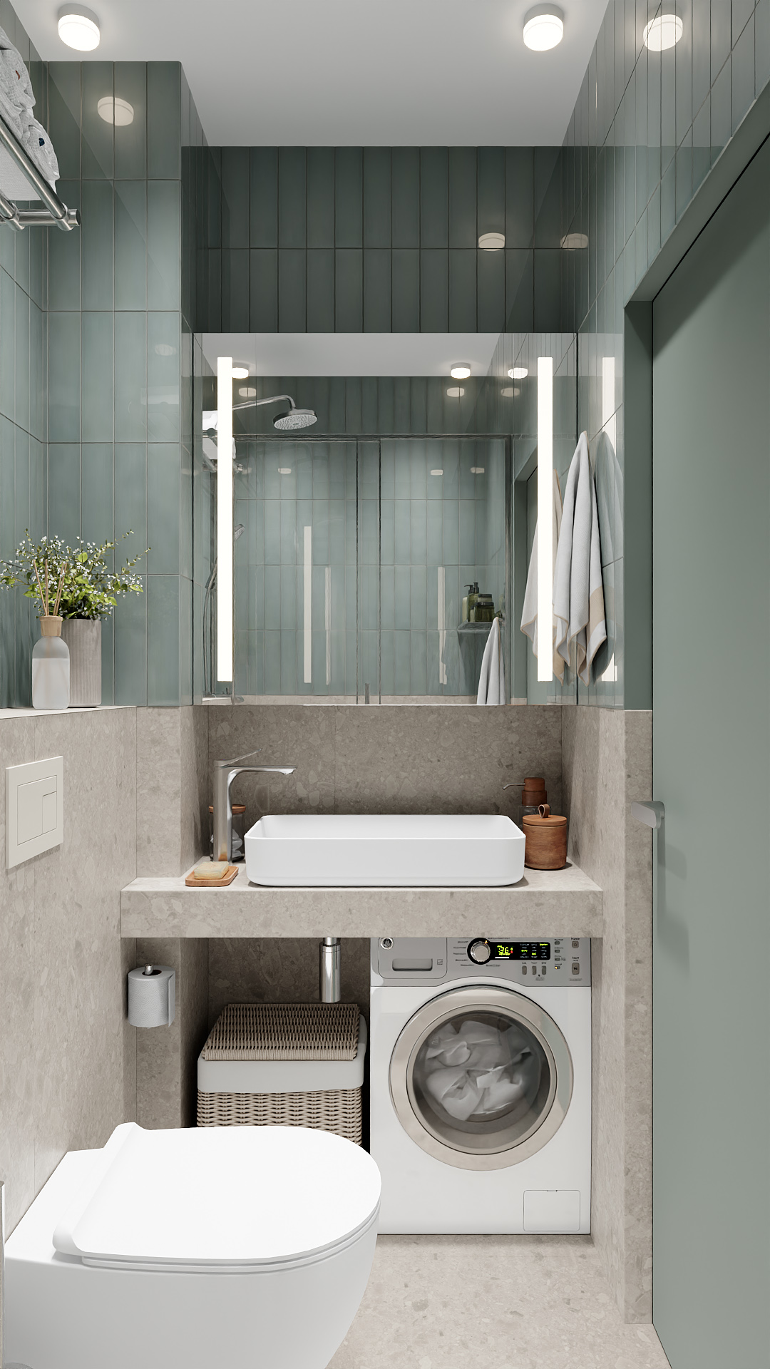 Современная компактная ванная в минималистичном стиле: серо-зелёная плитка на стенах создаёт спокойный фон, столешница под раковину имитирует натуральный камень. Центральные элементы — лаконичная прямоугольная раковина, стильная стиральная машина под ней и навесной унитаз. Большое зеркало с подсветкой визуально расширяет пространство. Акценты — плетёная корзина для белья, деревянные аксессуары и ваза с сухоцветами. Чистые линии, функциональность и гармония оттенков делают интерьер практичным и уютным
