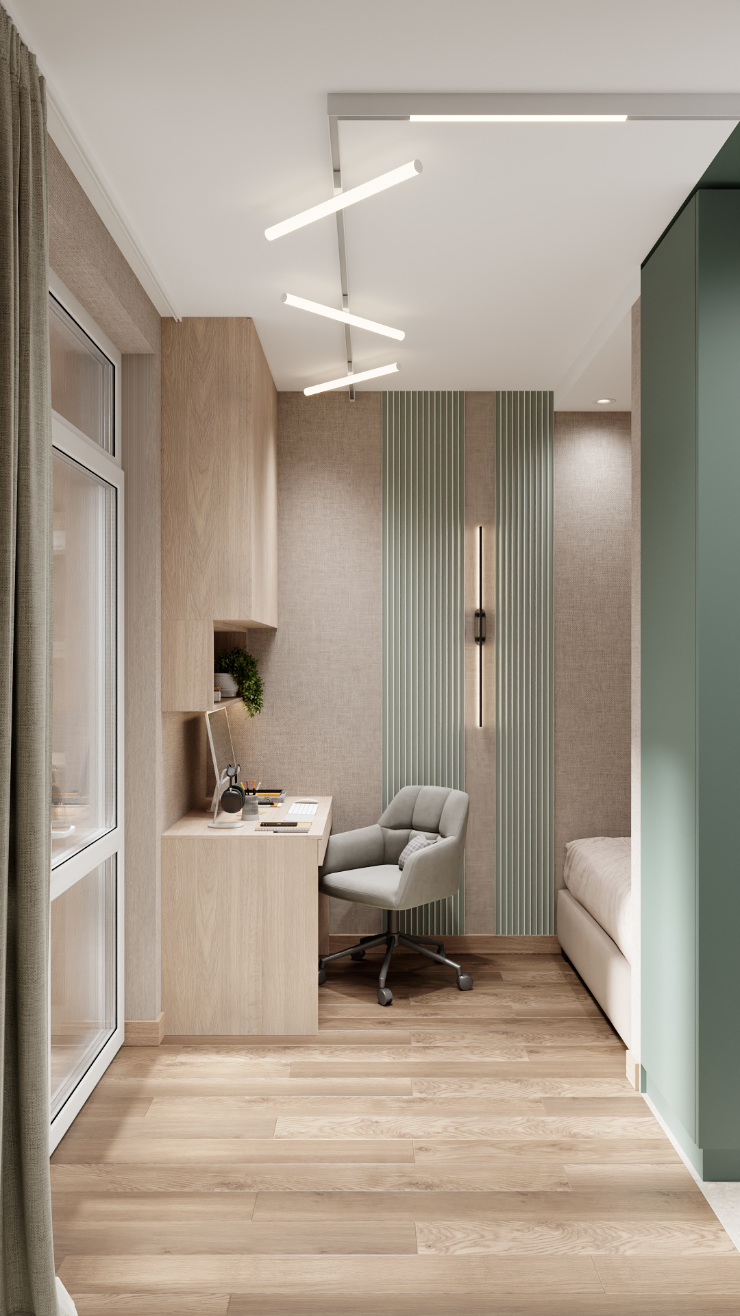 Компактная комната в скандинавском стиле: рабочее место с лаконичным столом и эргономичным креслом, мебель в светлом дереве, акцентная стена с вертикальными зелёными рейками. Мягкий дневной свет из большого окна, современное потолочное освещение. Минимализм, функциональность, спокойная цветовая гамма — баланс работы и отдыха