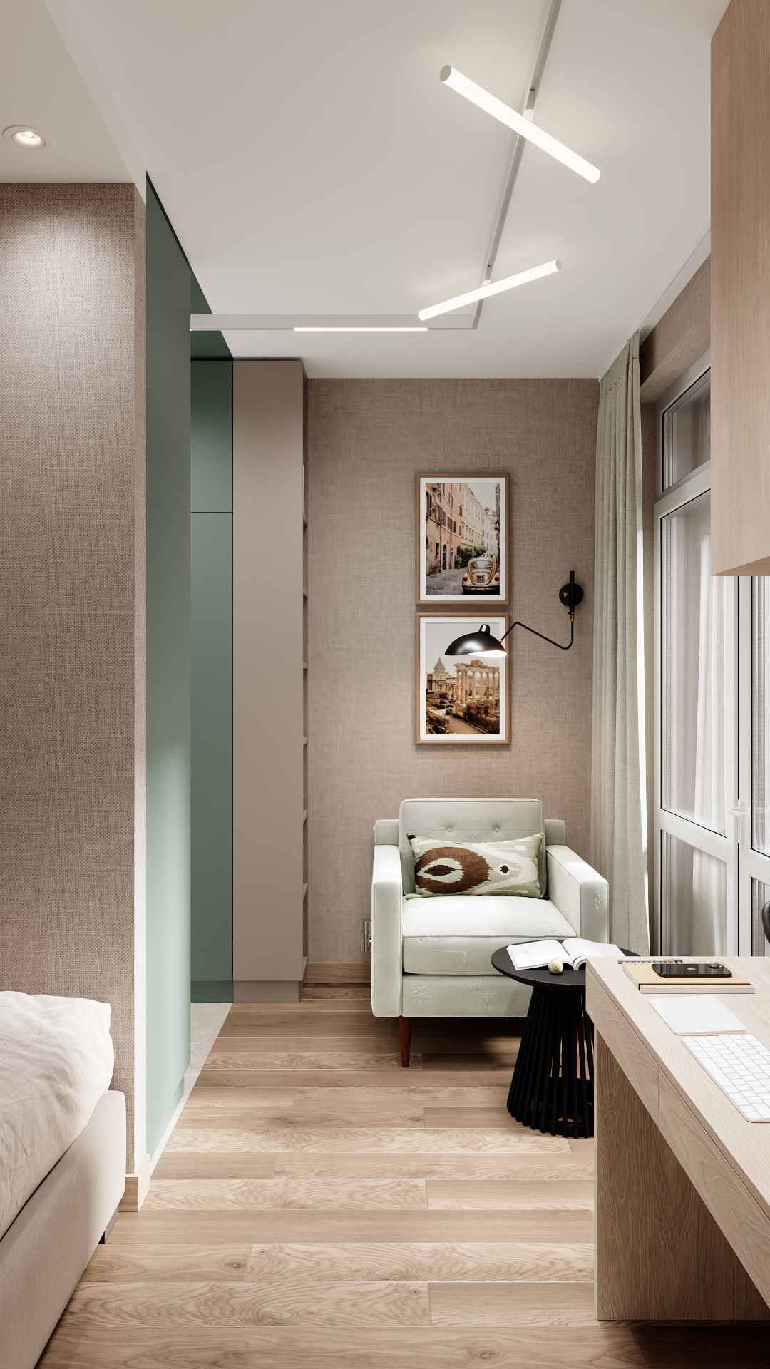 Компактная комната в современном стиле с зонированием: спальная зона с лаконичной кроватью, рабочая — с минималистичным столом и техникой, лаунж-зона — с мягким светло-зелёным креслом и круглым чёрным столиком. Стены в нейтральных бежево-серых тонах с текстурной отделкой, акцент — вертикальные панели приглушённого зелёного оттенка. Современные линейные светильники, лёгкие шторы, паркет светлого дерева. Чистые линии, функциональность, баланс уюта и стиля