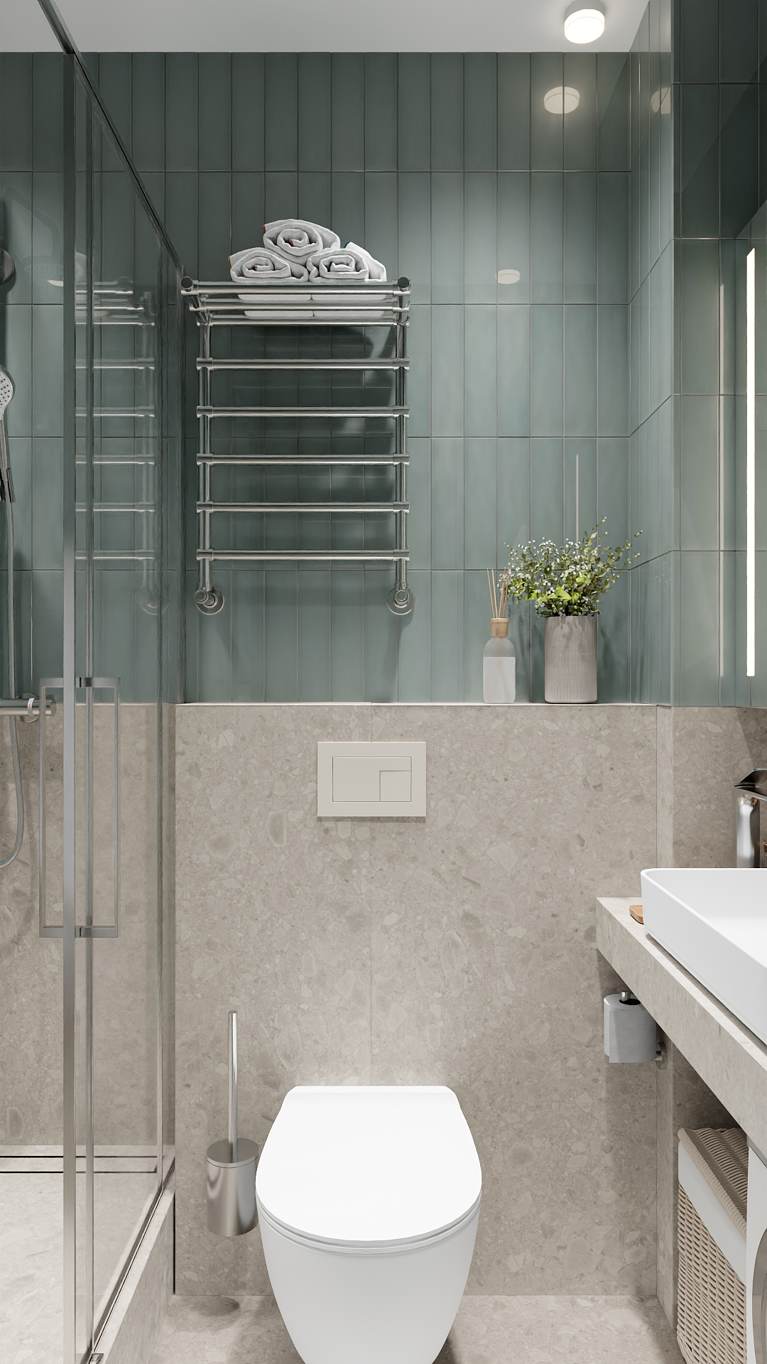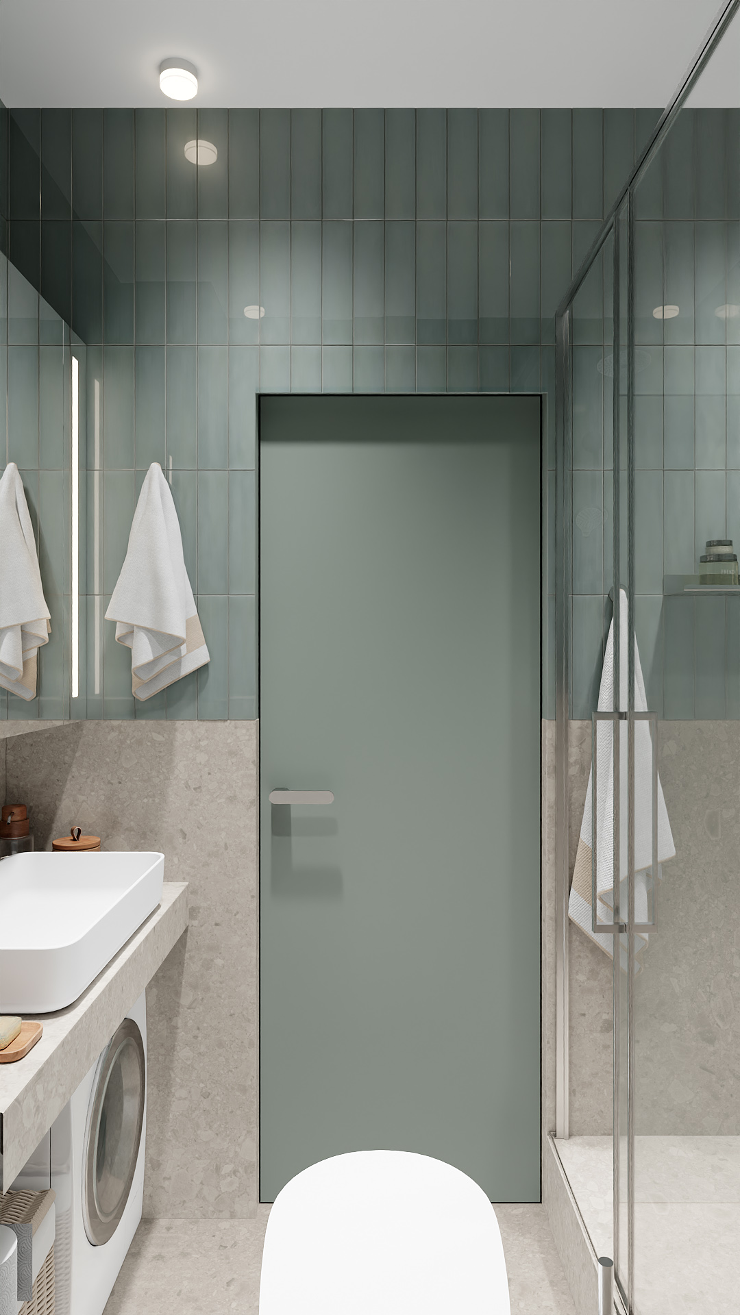 Современная ванная в минималистичном стиле: приглушённая серо-зелёная плитка на стенах, светлая каменная фактура на нижней части стен и полу. Центральные элементы — стеклянная душевая кабина с хромированной фурнитурой, лаконичная прямоугольная раковина на подвесной столешнице, встроенный стиральный автомат. Акценты — аккуратно сложенные белые полотенца на хромированных держателях, матовая дверь в тон плитке. Точечное освещение и чистые линии создают ощущение простора и уюта. Функциональность без излишеств — ключевая идея дизайна