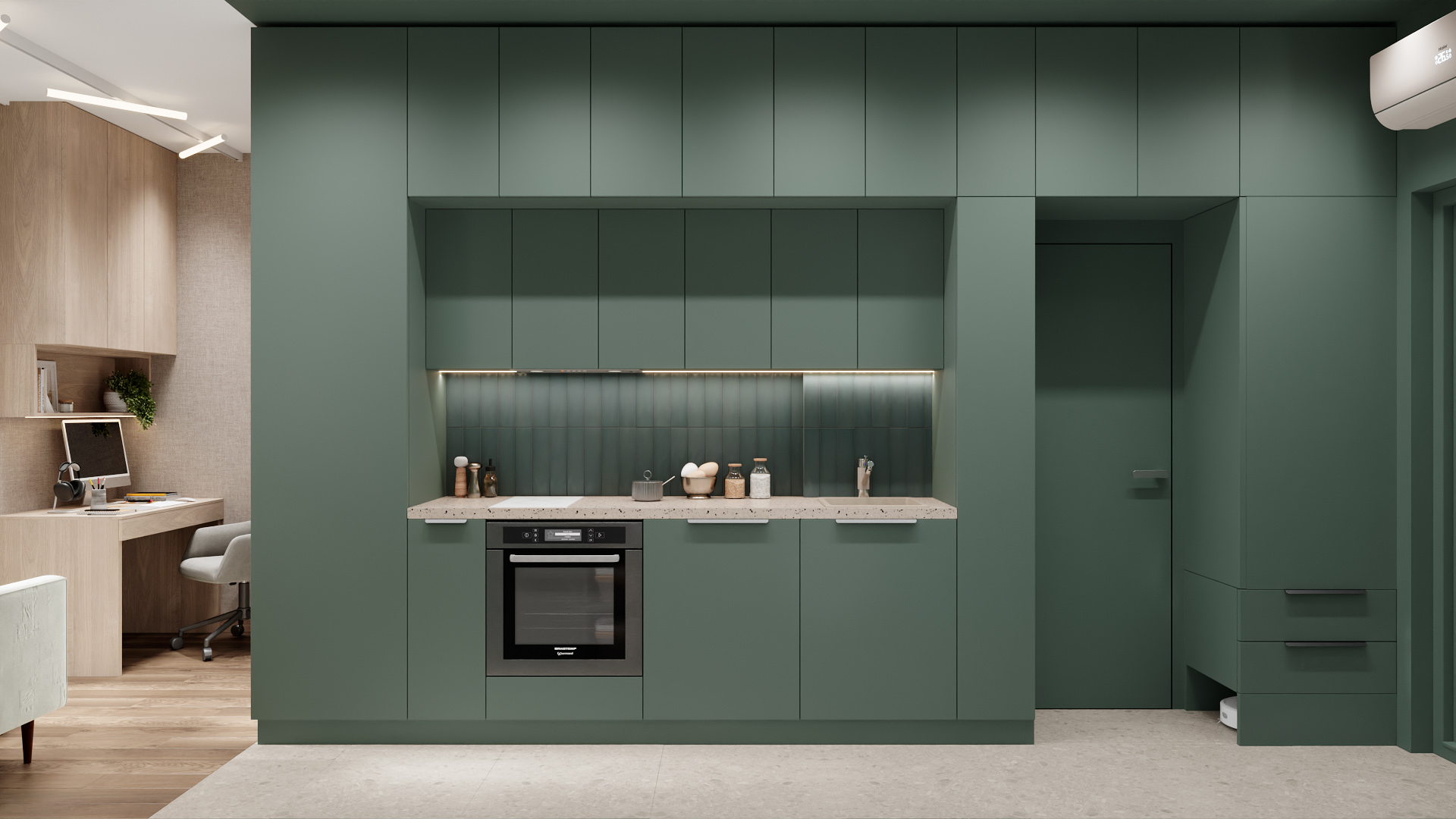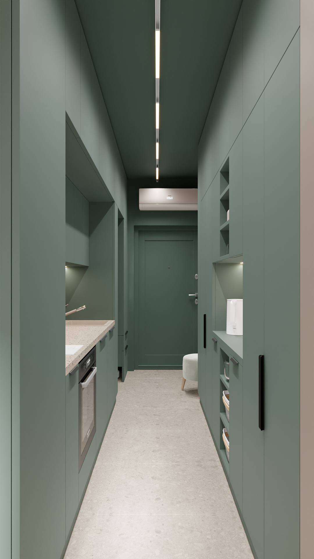 Узкая кухня-коридор в минималистичном стиле: доминирует глубокий зелёный цвет фасадов и стен, создающий ощущение уюта и спокойствия. Встроенные шкафы по обеим сторонам, лаконичные чёрные ручки подчёркивают современность. Слева — компактная кухонная зона с мойкой и встроенной духовкой, справа — открытые полки с посудой и закрытыми секциями для хранения. Дополнительный элемент — небольшой пуф у двери, создающий уюта. Линейное потолочное освещение равномерно заливает пространство мягким светом. Чистые линии, функциональность, гармония оттенков — идеальный баланс для компактного пространства