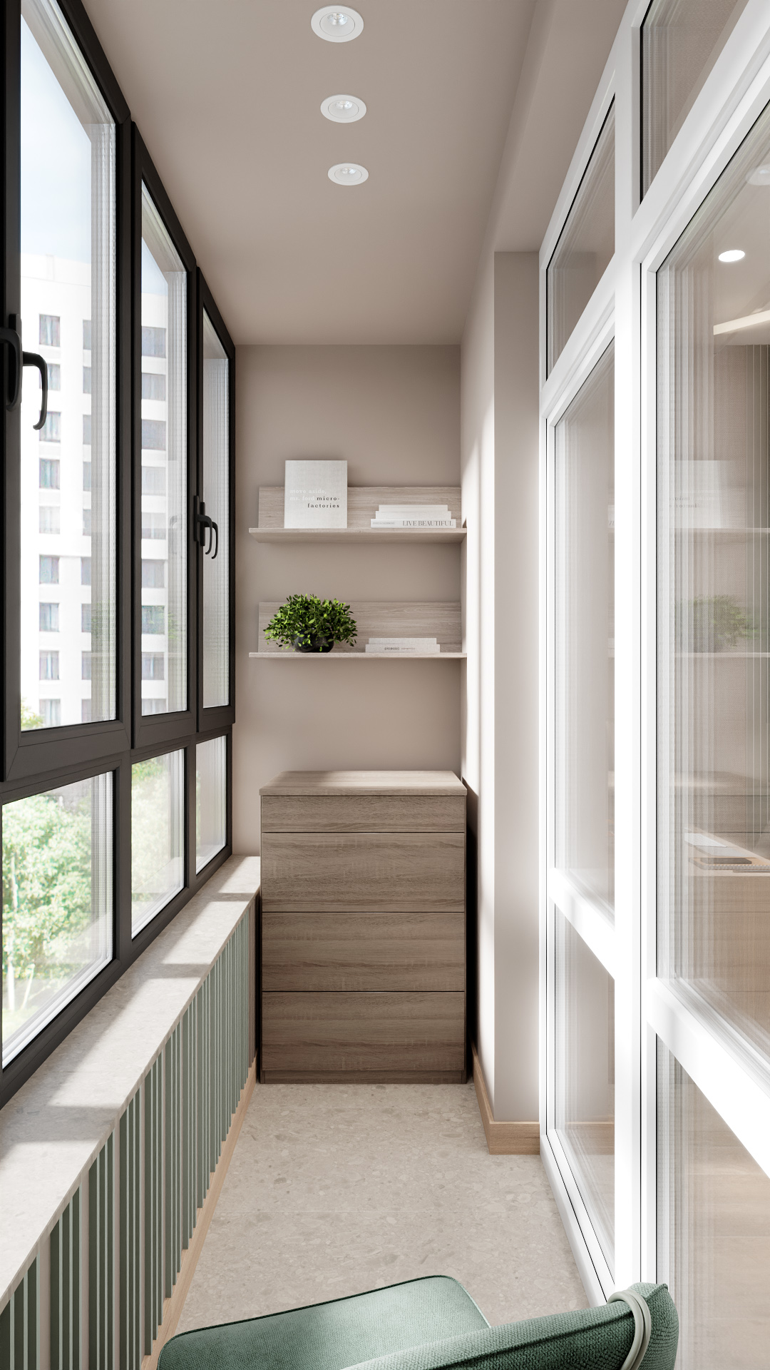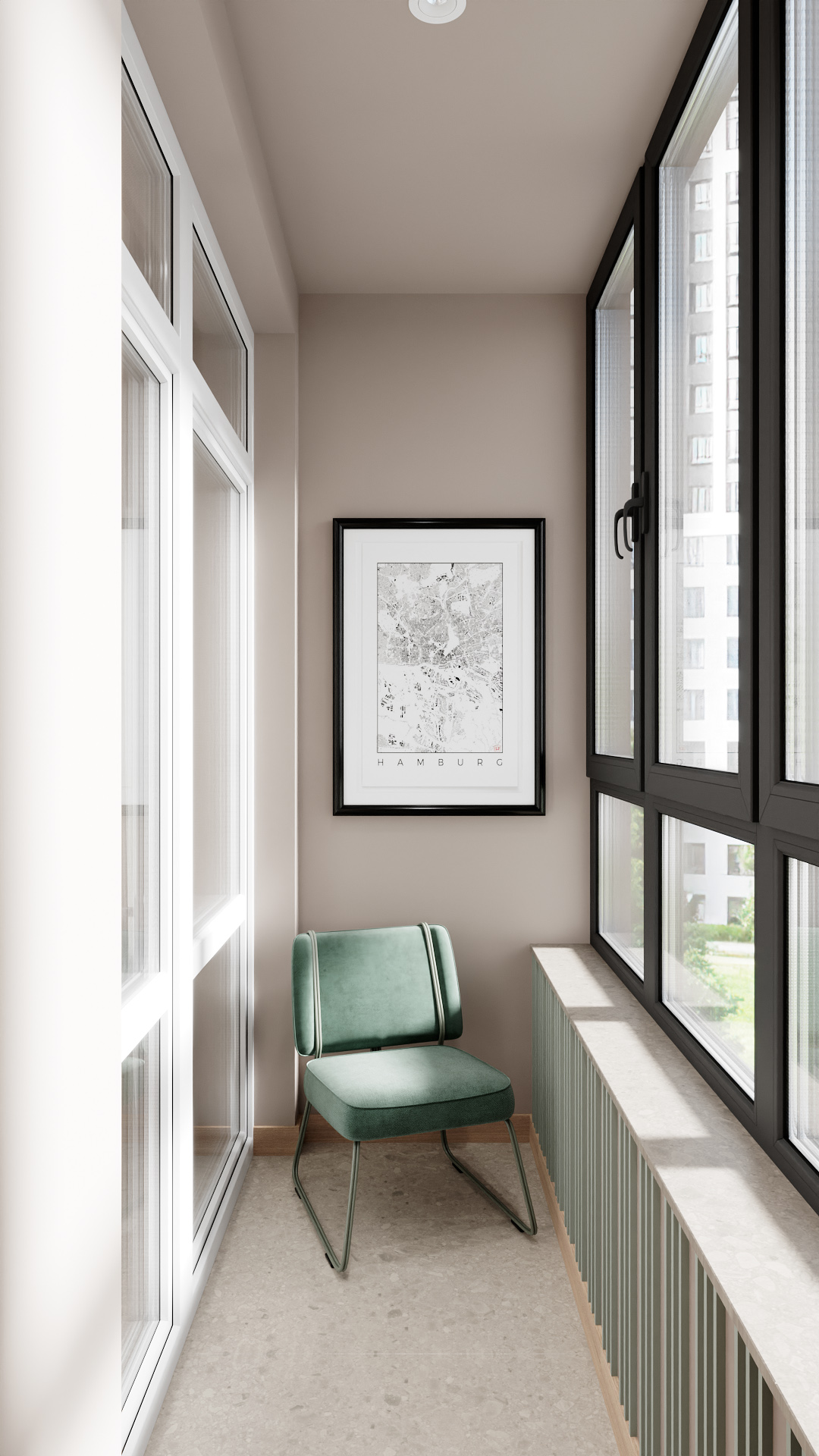 Компактный балкон в минималистичном стиле: светло-бежевые стены, большие окна с чёрными рамами для контраста. Центральное место — стильное зелёное кресло с металлическими ножками, создающее зону для отдыха. Над креслом — картина в чёрной раме с картой Гамбурга, добавляющая интеллигентный акцент. Вдоль окна — декоративные молдинги в тон креслу. Светлое напольное покрытие завершает лаконичный образ. Просто, уютно, с продуманными деталями