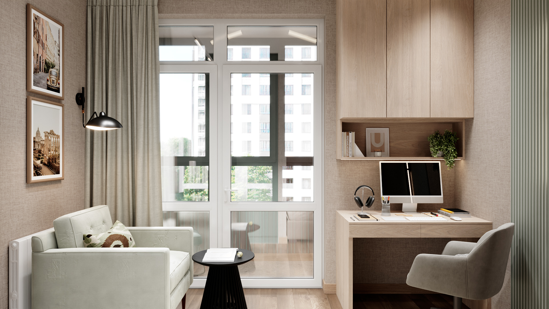 Уютное рабочее пространство в нейтральных бежево-серых тонах: