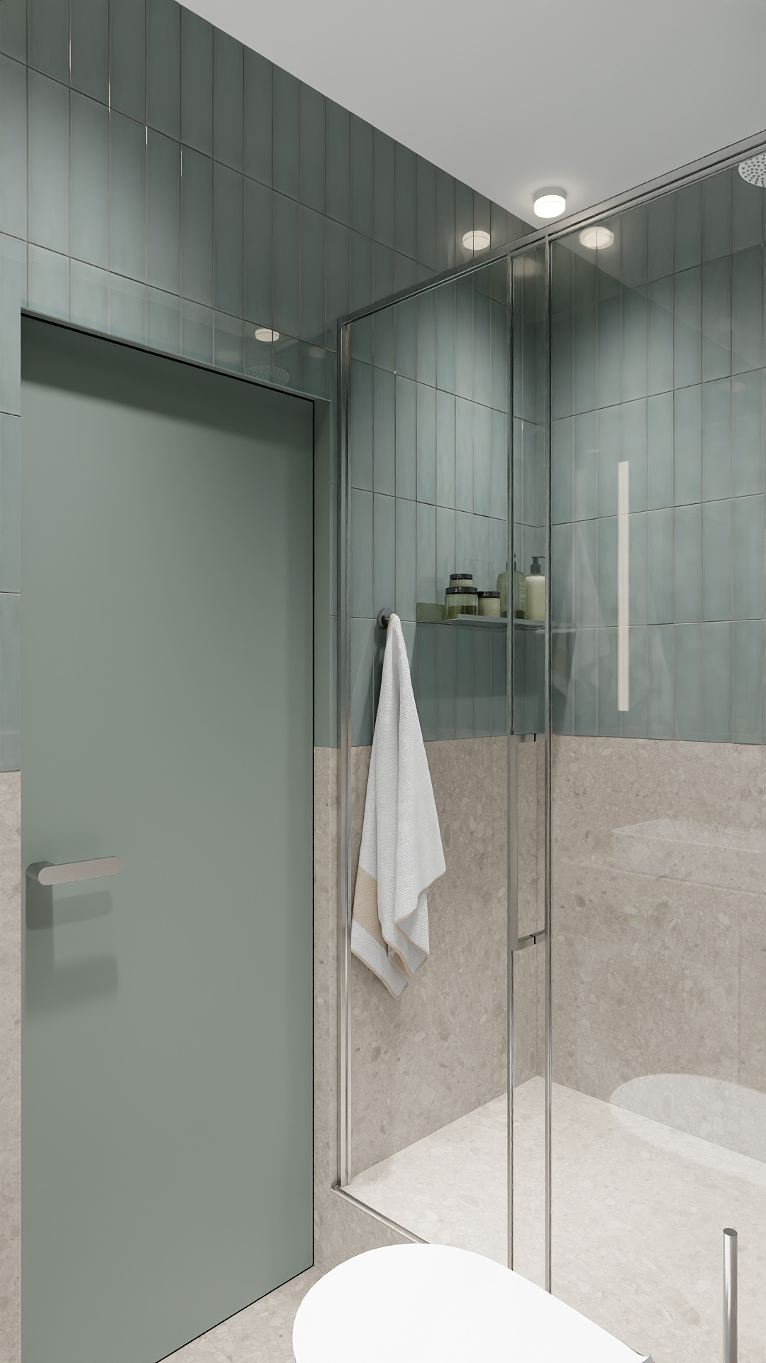 Современная ванная в минималистичном стиле: сочетание матовой серо-зелёной плитки на стенах и светлого каменного покрытия в нижней части. Центральным элементом стала просторная душевая кабина с прозрачными стеклянными стенками и хромированным профилем. Акцент — лаконичная полка внутри душевой с аккуратно расставленными банными принадлежностями. Дополняют образ матовая дверь в тон плитке и белоснежное полотенце на стильном держателе. Мягкий рассеянный свет от встроенных светильников создаёт уютную атмосферу. Чистые линии и сдержанная палитра подчёркивают функциональность и элегантность пространства