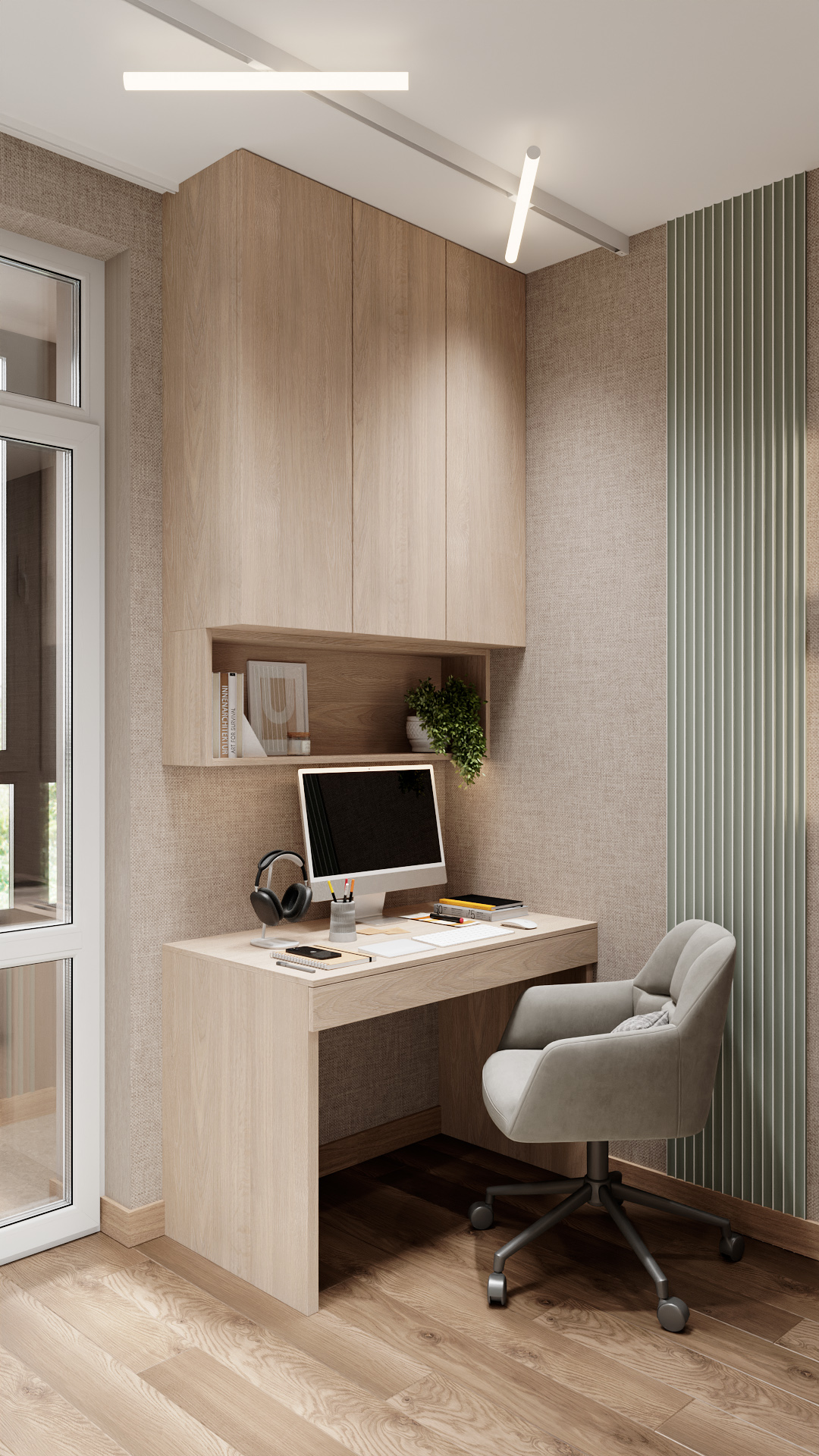 Компактный рабочий уголок в светлых древесных тонах. Навесной шкаф с открытой полкой для книг и декора, лаконичный стол с минималистичной организацией, эргономичное серое кресло на колёсах. Акцент — вертикальная панель с рифлёной текстурой в приглушённом зелёном оттенке. Естественный свет из окна, современное потолочное освещение. Чистые линии, функциональность, уют