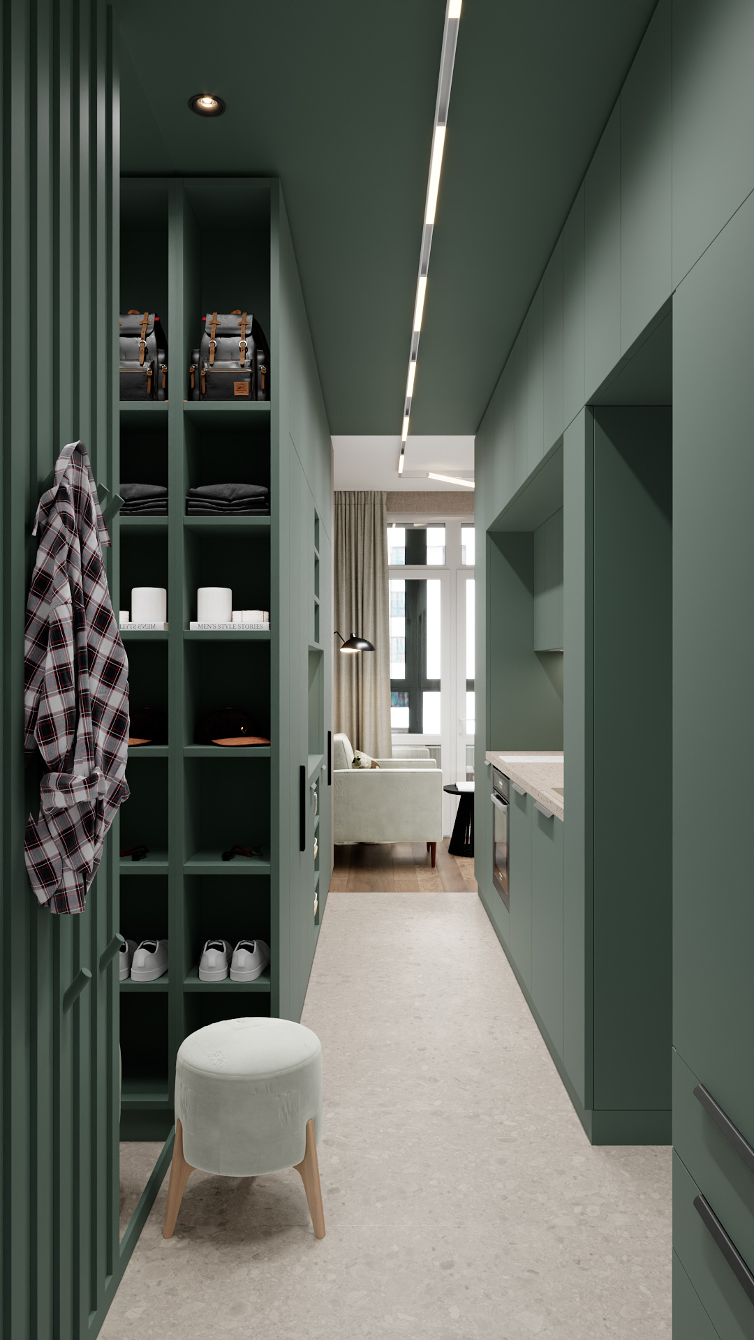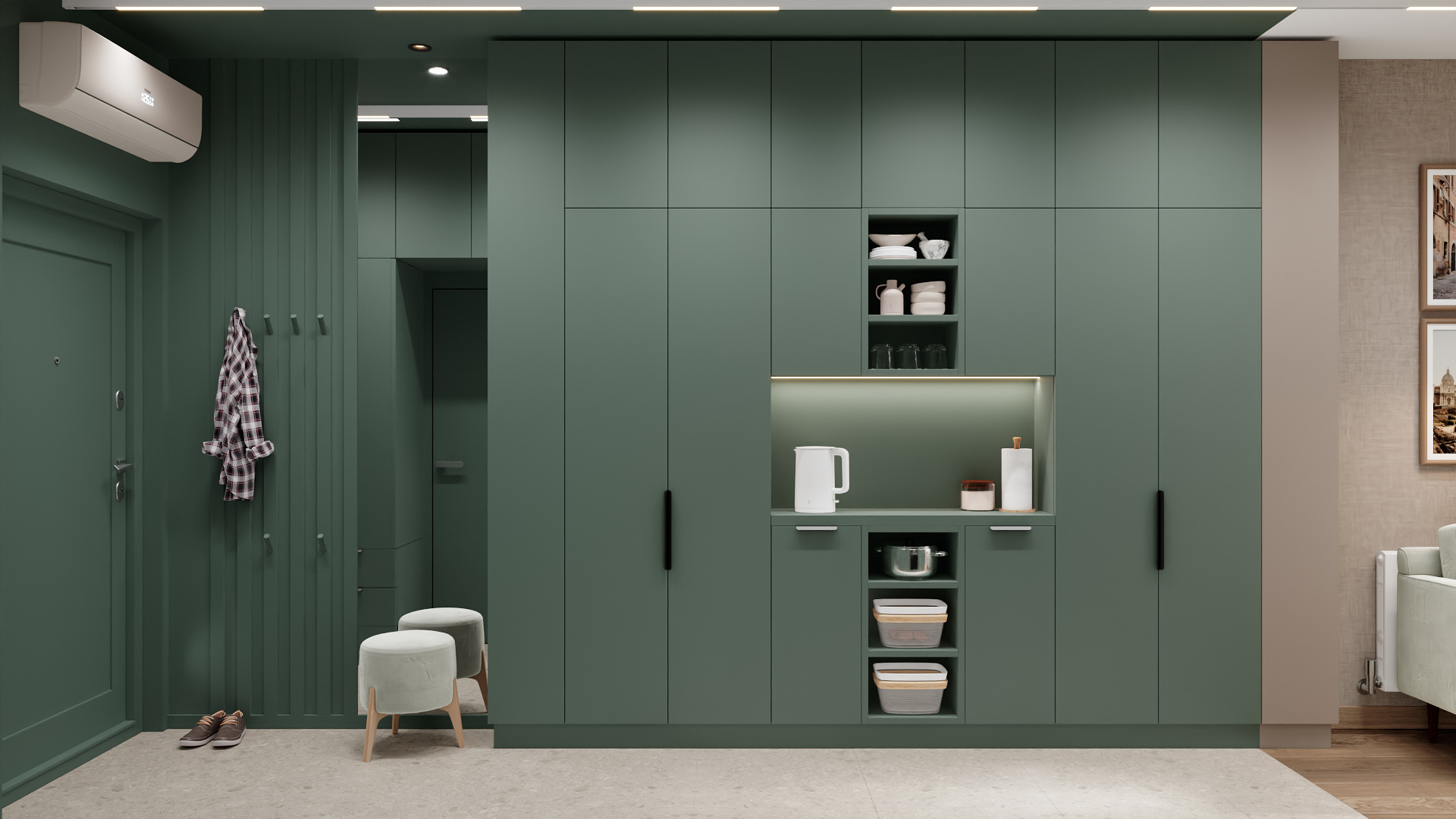 Компактная прихожая в современном стиле с доминирующим глубоким зелёным цветом стен и мебели. Открытые стеллажи с аккуратно сложенными вещами и обувью, мягкий пуф на деревянных ножках для удобства. Линейное потолочное освещение подчёркивает геометрию пространства. Справа — фрагмент кухни в той же цветовой гамме, слева — оригинальная вешалка. Чистые линии, функциональность, сдержанная цветовая палитра создают ощущение порядка и уюта