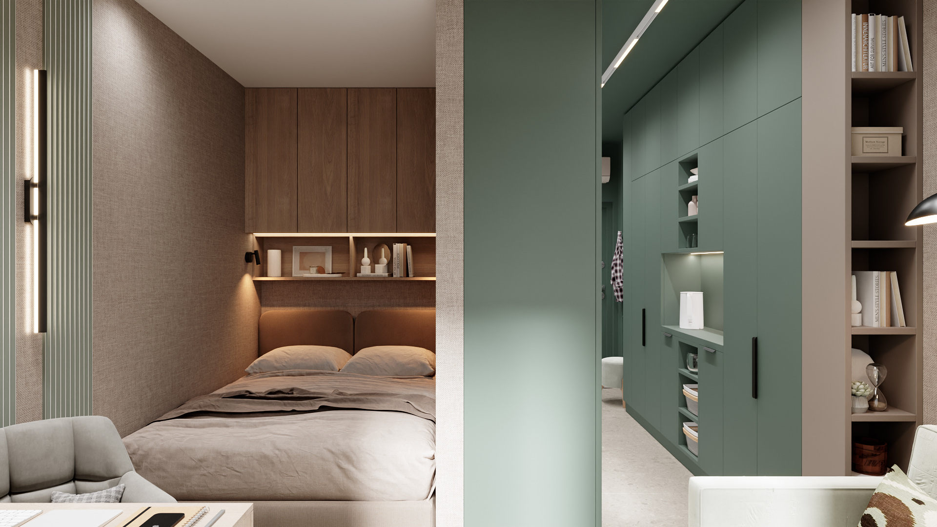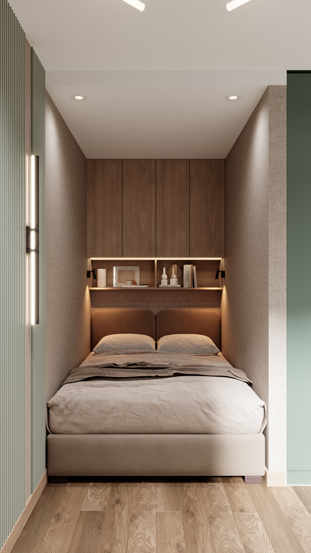 Компактная спальня в минималистичном стиле: кровать с мягким изголовьем встроена в нишу, над ней — навесной шкаф и открытая полка с подсветкой для декора и книг. Стены в нейтральных бежево-серых тонах, акцент — вертикальные рифлёные панели в приглушённом зелёном оттенке. Пол — светлый паркет, мягкое освещение создаёт уютную атмосферу. Лаконично, функционально, уютно