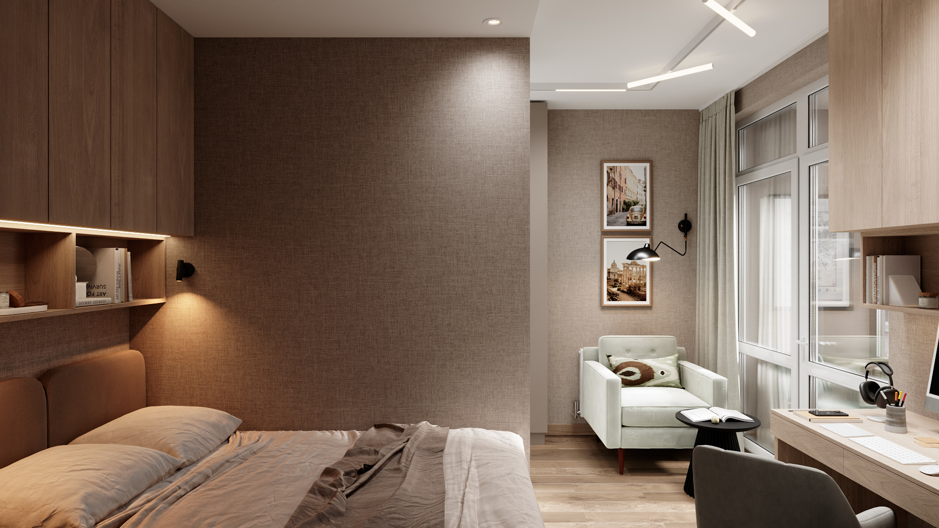 Компактная спальня в нейтральных бежево-коричневых тонах. Зонирование: спальная зона с кроватью и навесным шкафом, рабочая зона с письменным столом и креслом, уголок для отдыха с креслом и кофейным столиком. Текстурированные стены, лаконичные светильники, картины в рамах добавляют уюта. Большое окно с лёгкими шторами обеспечивает естественный свет. Минимализм, функциональность, гармония