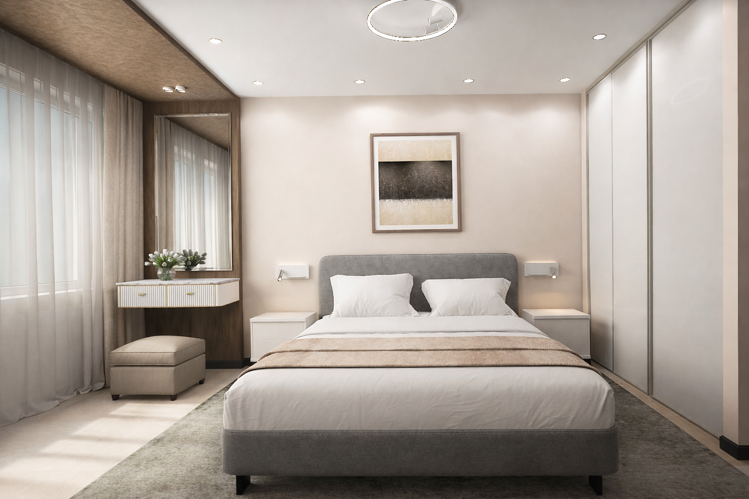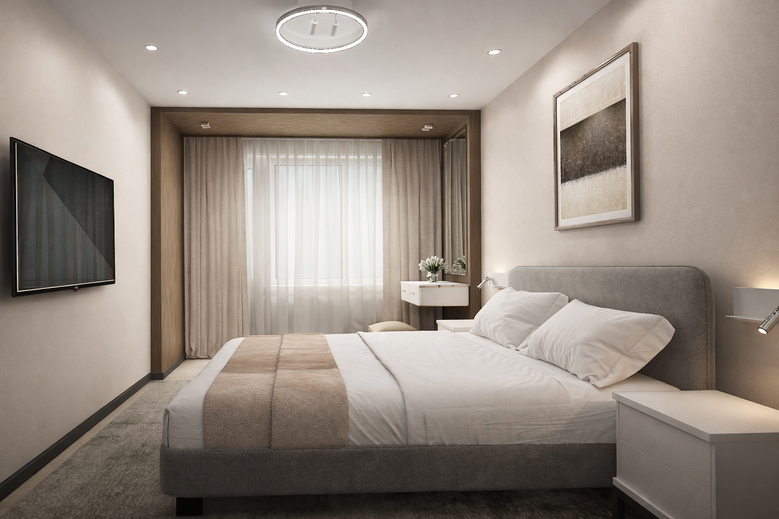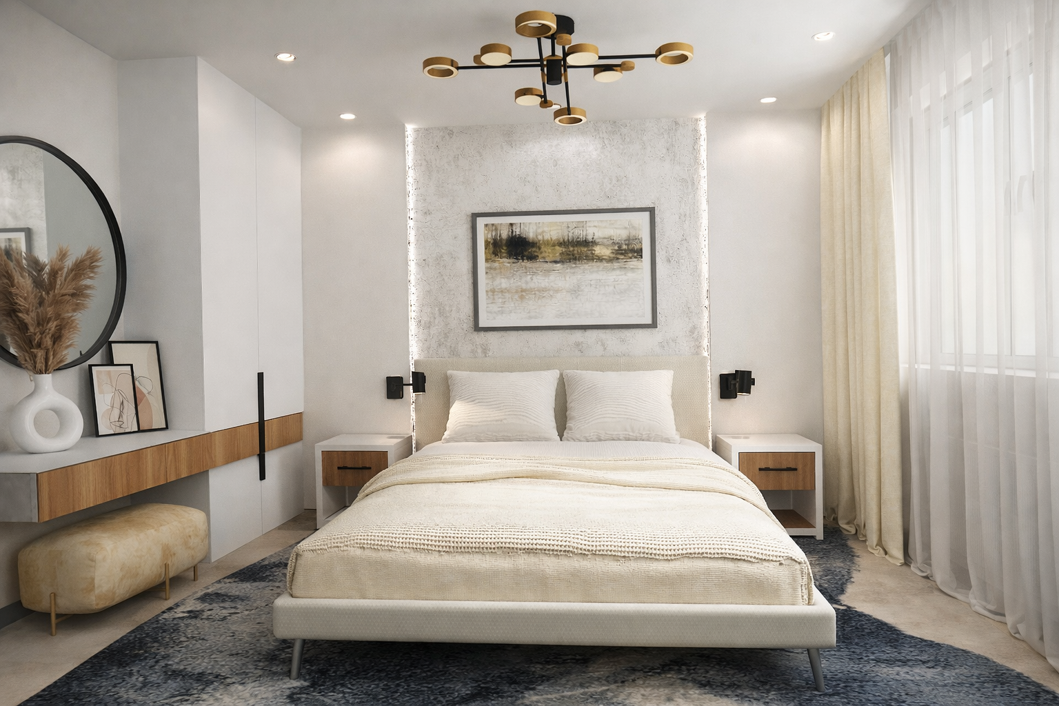 Очень прикольно продлили шкафчик в спальне подвесной тумбой (я про полосу на фасадах). По крайней мере на визуализации, интересно, удастся ли воплотить на практике.