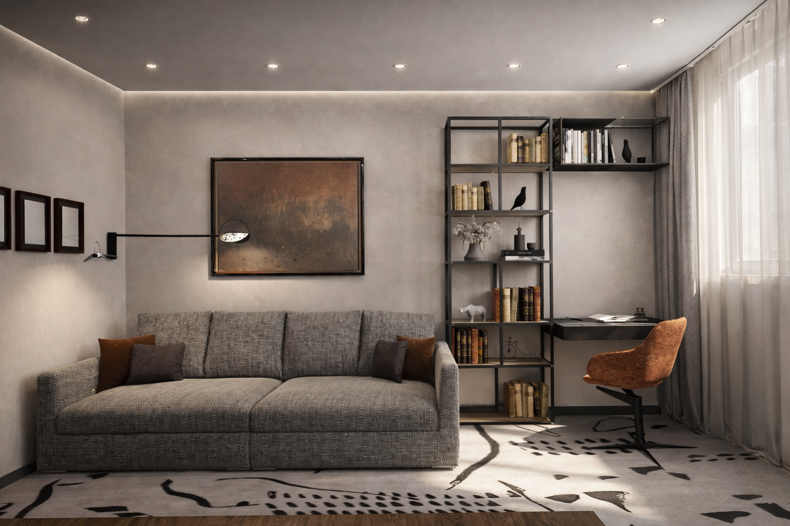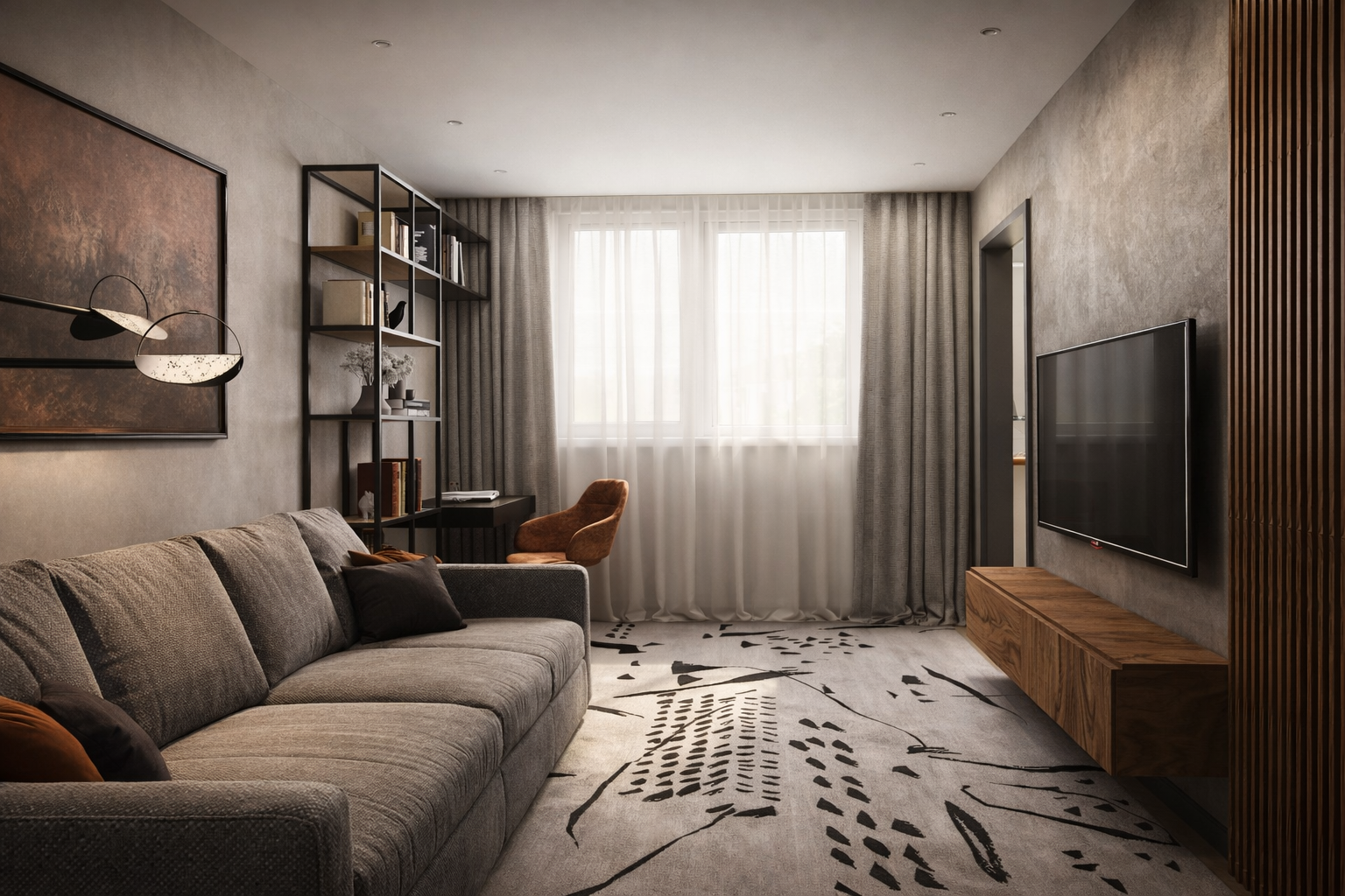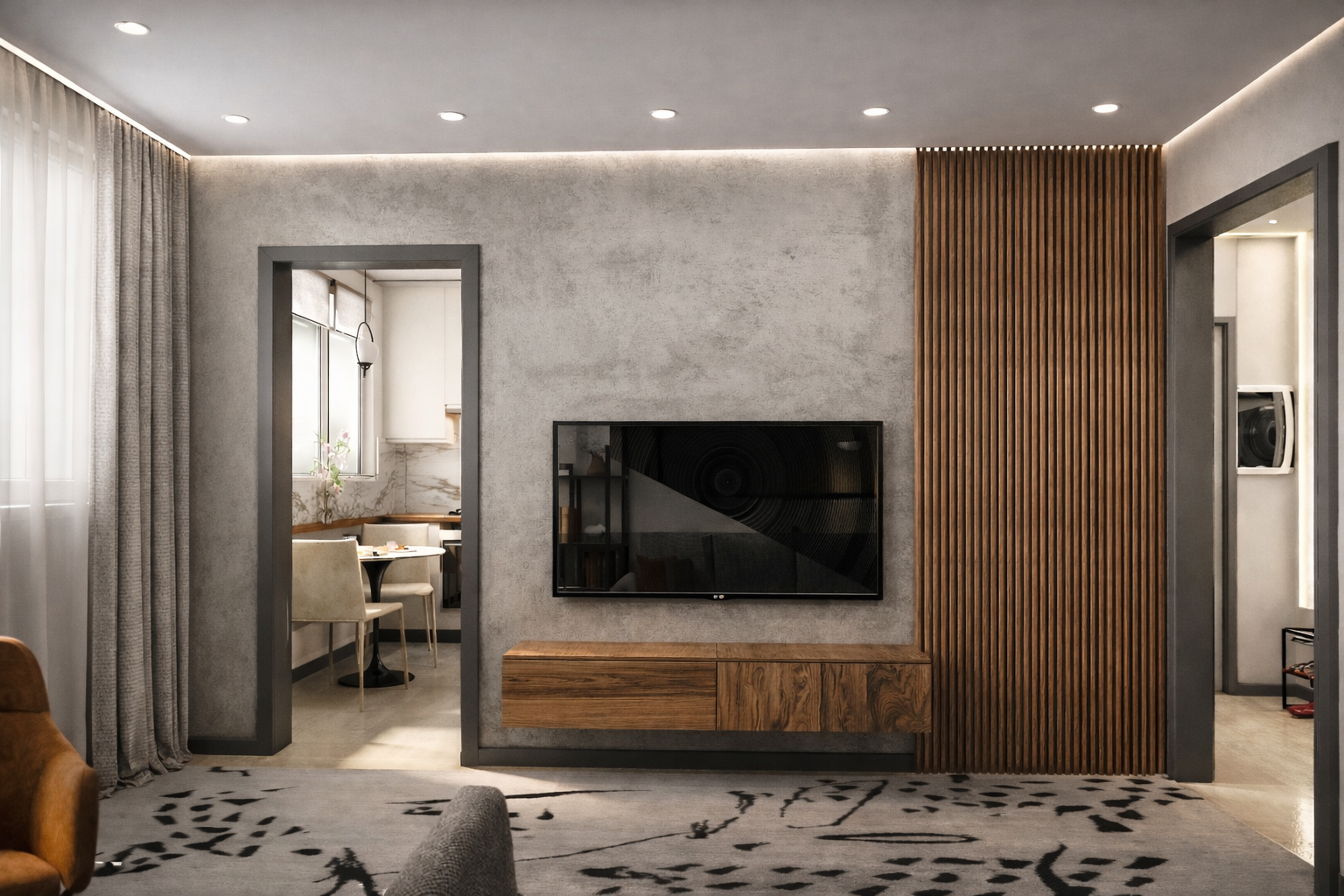 Очень прикольно продлили шкафчик в спальне подвесной тумбой (я про полосу на фасадах). По крайней мере на визуализации, интересно, удастся ли воплотить на практике.