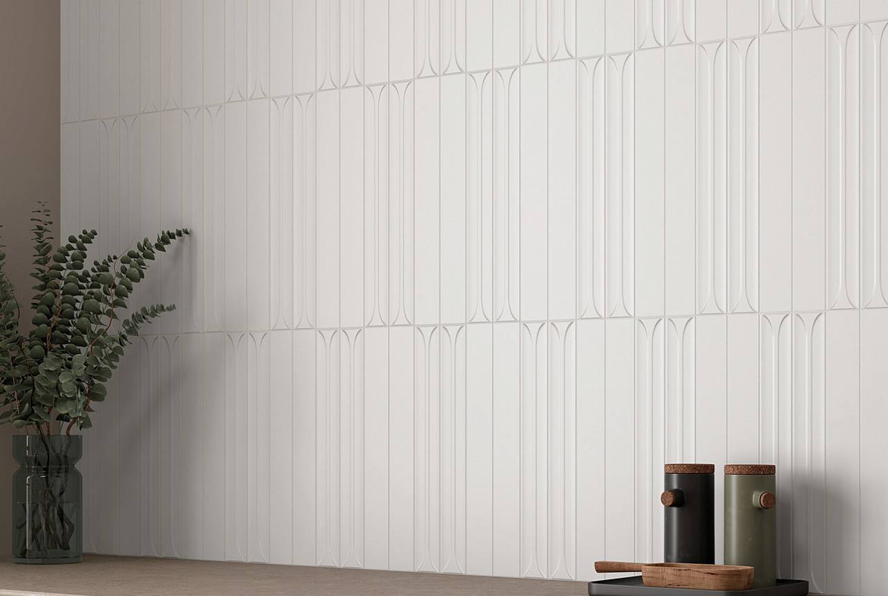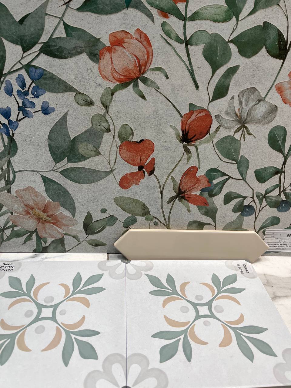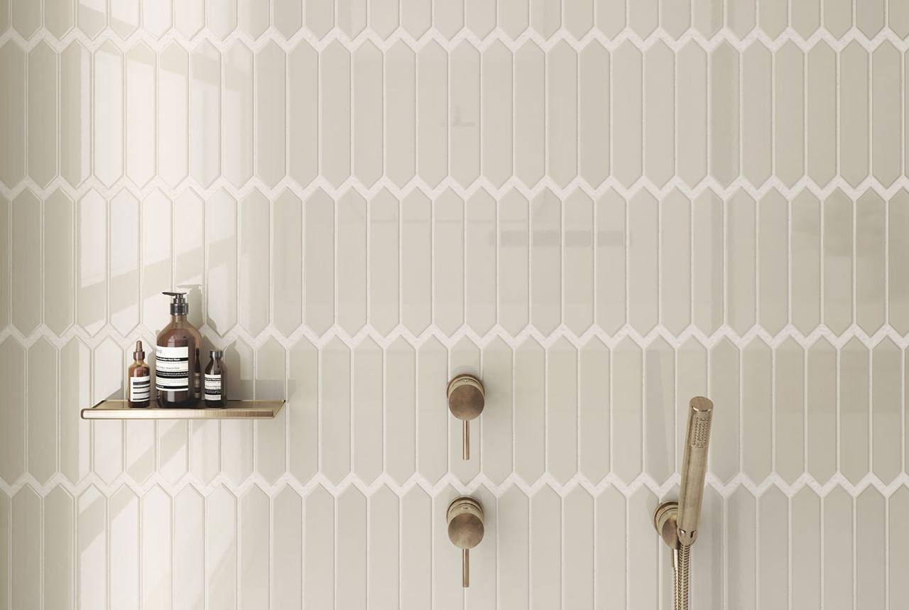 В первой ванной заказчик очень хотел цветочный акцент на стене, но переживал, что обои с цветами будут неуместны во влажной зоне. Решение нашлось: мы подобрали влагостойкую плитку с крупным цветочным рисунком. К ней в пару - напольное покрытие с мелким растительным орнаментом: лепестки и листья перекликаются с настенным узором. А для остальных стен выбрали спокойную бежевую плитку из коллекции Arrow фабрики Equip. На первый взгляд - просто нейтральный фон, но необычная форма делает её по‑настоящему стильной.