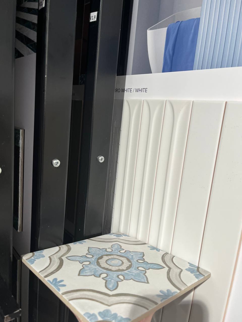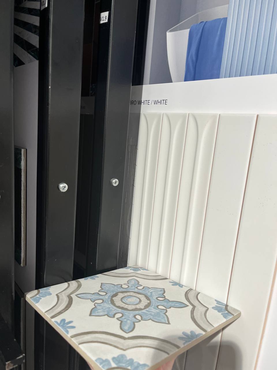Во второй ванной мы продолжили игру с фактурами и формами. Там тоже появилась плитка Equip - мелкая, с нестандартным рельефом. К ней подобрали гладкую плитку‑компаньон, с которой можно экспериментировать при укладке. Напольное покрытие выбрали с голубым узором «под ручную роспись» - без строгой геометрии, но с характером. А в качестве изюминки задумали фреску с растительным орнаментом на голубом фоне - она будет перекликаться с цветом напольной плитки. Пока фреска только в планах, но образ уже сложился.