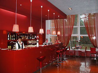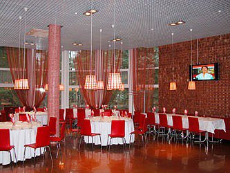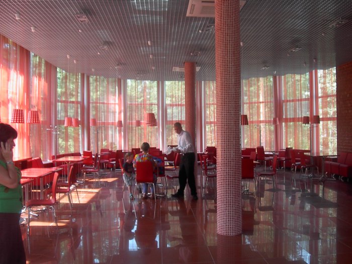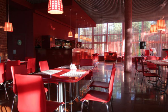 Яркое, вкусное кафе, оформленное в красно-оранжевых тонах, которые, как известно, повышают аппетит )