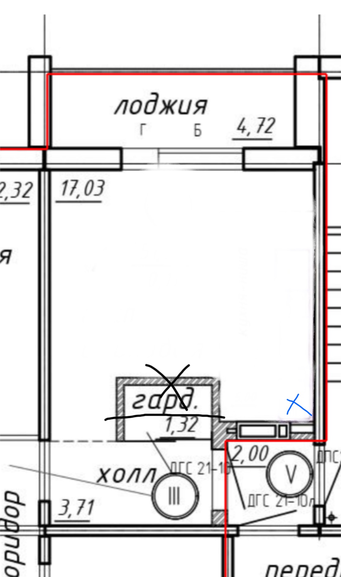 Помогите организовать кухню-гостиную 17 кв. Есть выход на балкон. Часть гардеробной хотим снести. Стояк справа внизу (примерно где синий крестик)