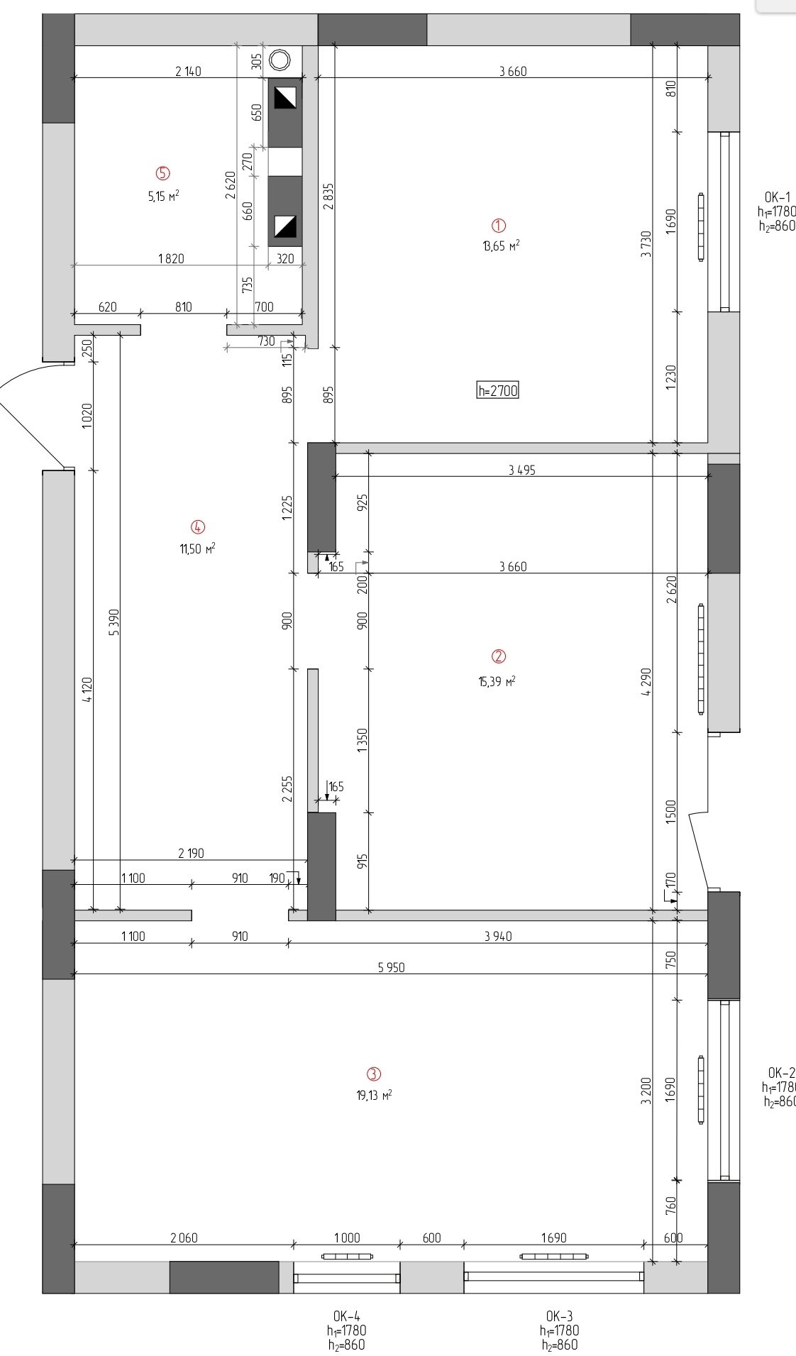 Прошу оценить или сказать где мы просчитались. Нас смущает то, что в детской одно окно, может быть темно, а в спальне наоборот 2 окна. Также смущает, что мы из 1 большого коридора делаем 2 маленьких. Ломаем голову.