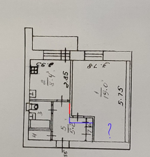 Дверь в комнату хотим перенести на другую стену (на плане место переноса обозначено красным цветом). В коридоре в доль стены где была дверь слелать шкаф и напротив него прихожую с банкеткой и вешалками для одежды. Хотелось бы узнать мнение аудитории, хорошая ли это идея. А также необходимы ваши идеи по поводу планировки мебели в комнате. Не могу определиться: в нише в комнате сделать гардероб или альков для кровати.